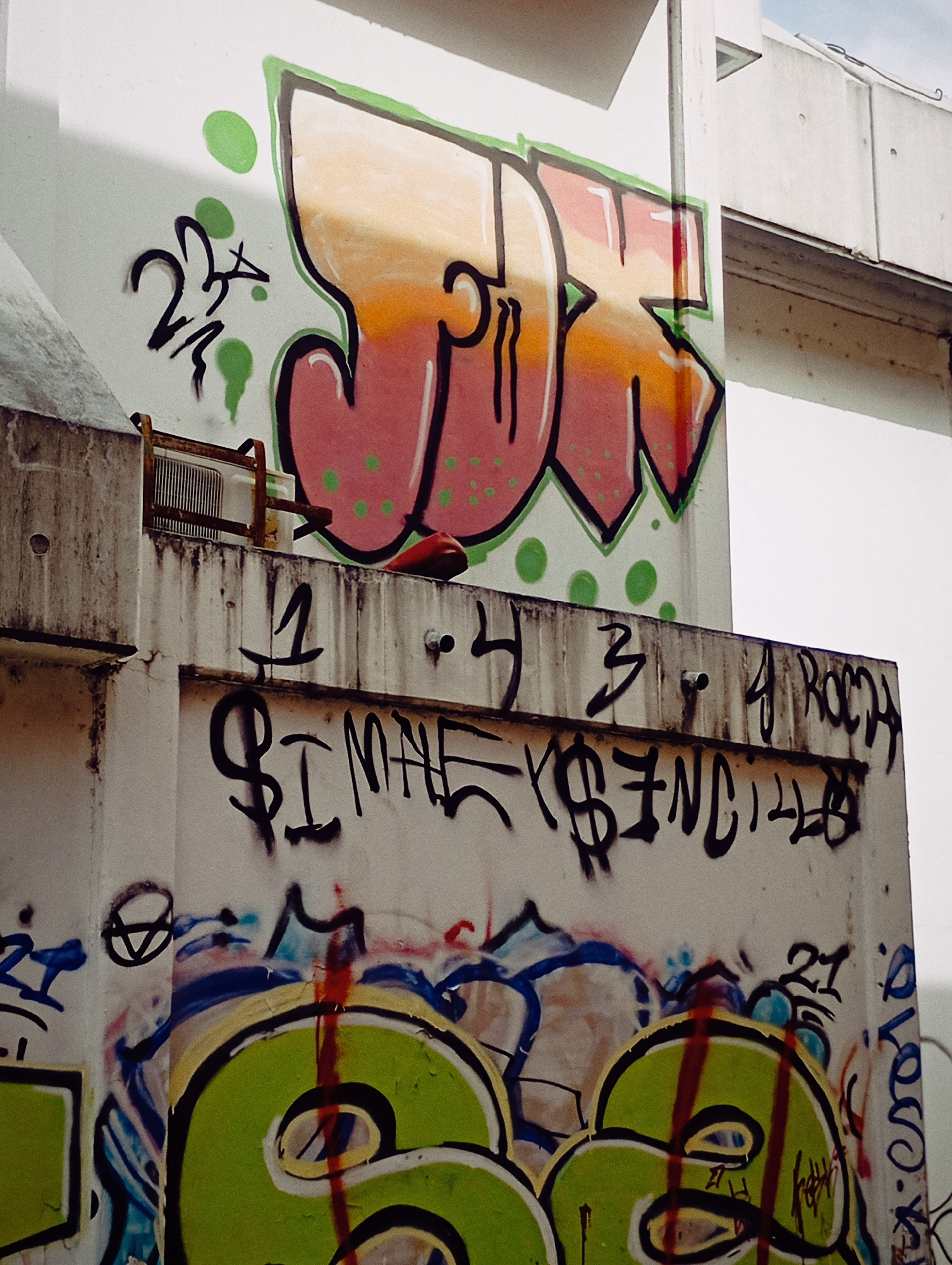 An outdoor, eye-level shot shows concrete structures covered in graffiti. The top layer of graffiti is on a vertical surface, with large, stylized letters "JK" in shades of orange, pink, and red, outl…read more
