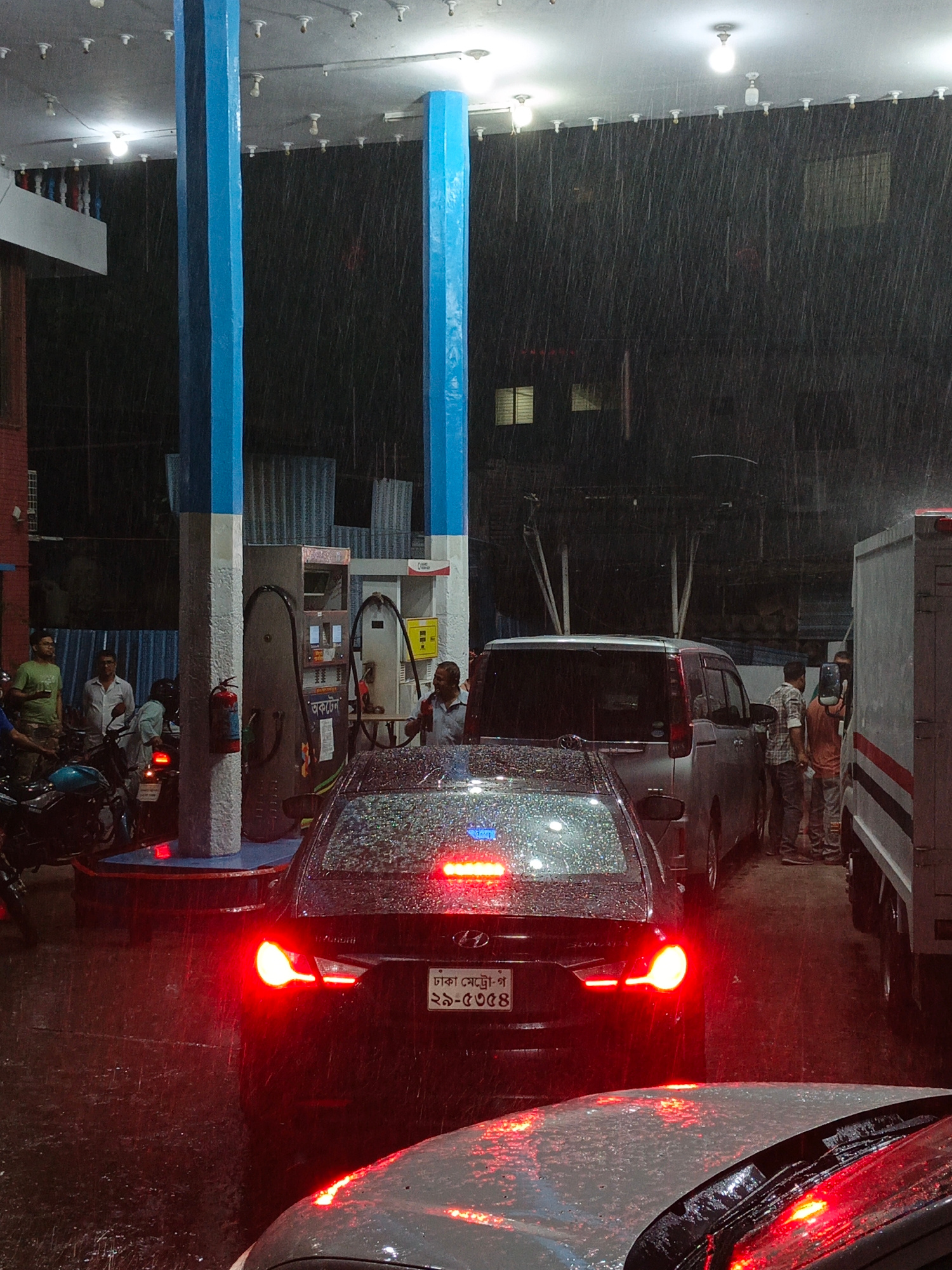 At a gas station in Dhaka, Bangladesh, it is raining heavily at night. Cars and motorcycles are lined up at the pumps. Several people are visible: gas station attendants, drivers, and passengers. Stre…read more