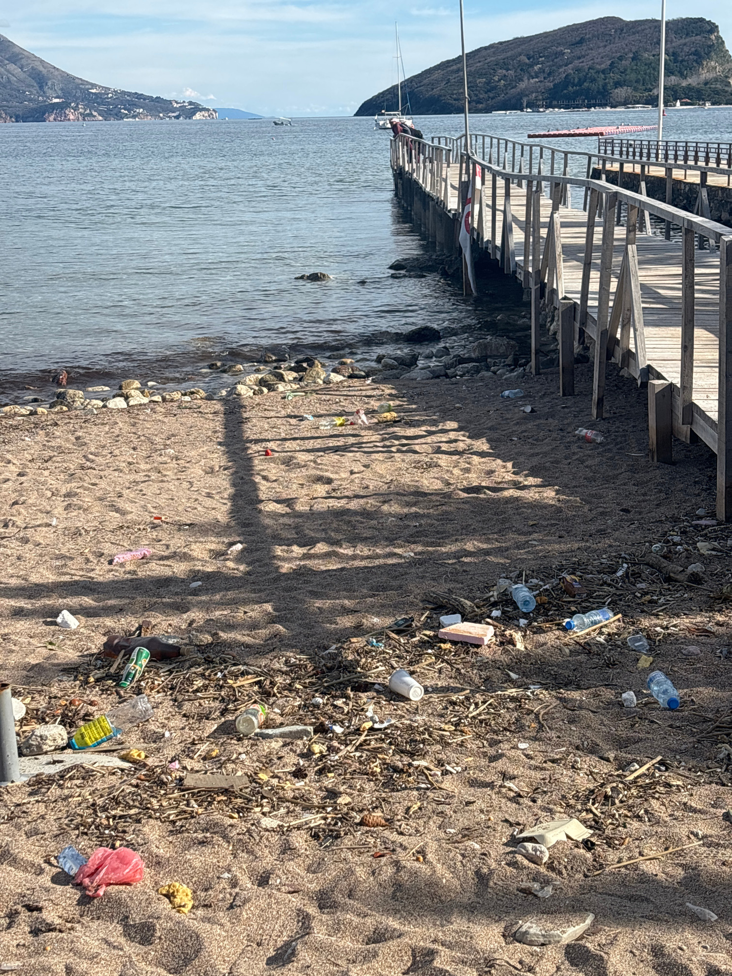 The image depicts a beach shoreline in Budva, Montenegro littered with trash. A wooden pier extends along the left side of the frame, over the water. The beach is sandy with scattered debris includingβ¦read more