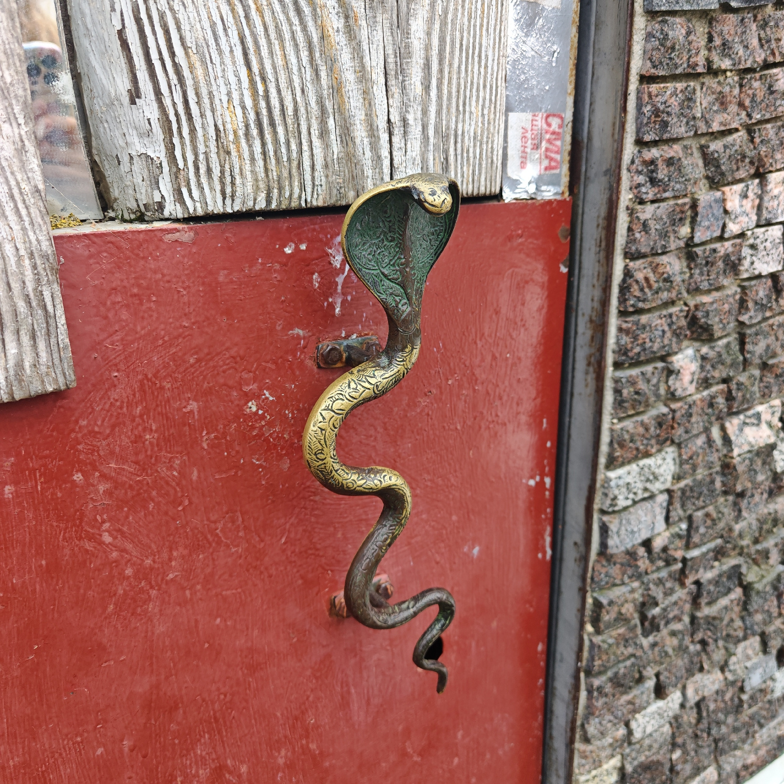 A medium, eye-level shot shows a cobra-shaped door handle on a red door with peeling paint. The handle is made of brass, with detailed engravings along the snake’s body. The cobra’s head is raised and flared, with a green interior. The handle is attached to the door with visible screws. To the left of the door, there is a weathered wooden surface with peeling white paint. To the right, there is a stone wall made of small, dark-colored bricks. At the top of the door is a sticker with the letters "CMA" and other Cyrillic text. Based on the availability of this style of architecture and door handles, it is suspected that this photo was taken in Rostov, Russia. | Open Wire