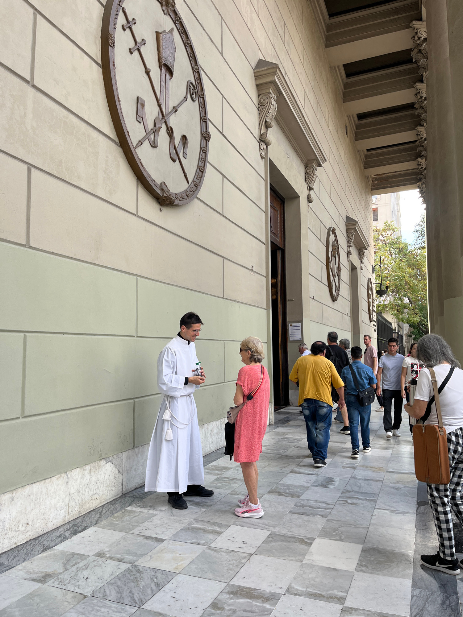 A line of people extends away from the camera along the facade of the Metropolitan Cathedral of Buenos Aires, Argentina. A man in clerical garb stands near the front of the line, holding an object inβ¦read more