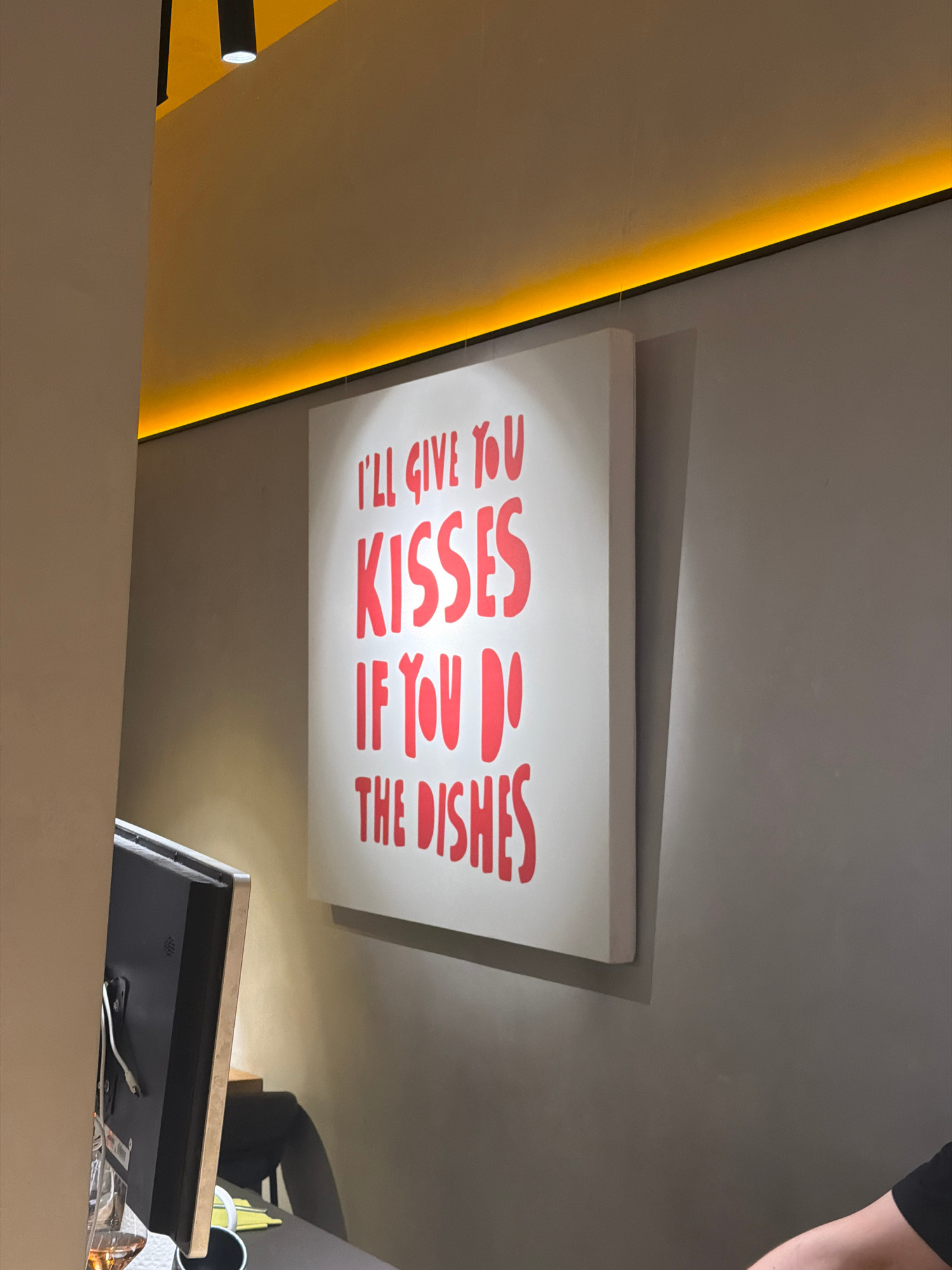 The image, taken in Krasnoyarsk, Russia, displays an indoor scene, likely a contemporary kitchen or dining area in a cafe or home. The central focus is a white rectangular sign with bold red capital lā¦read more