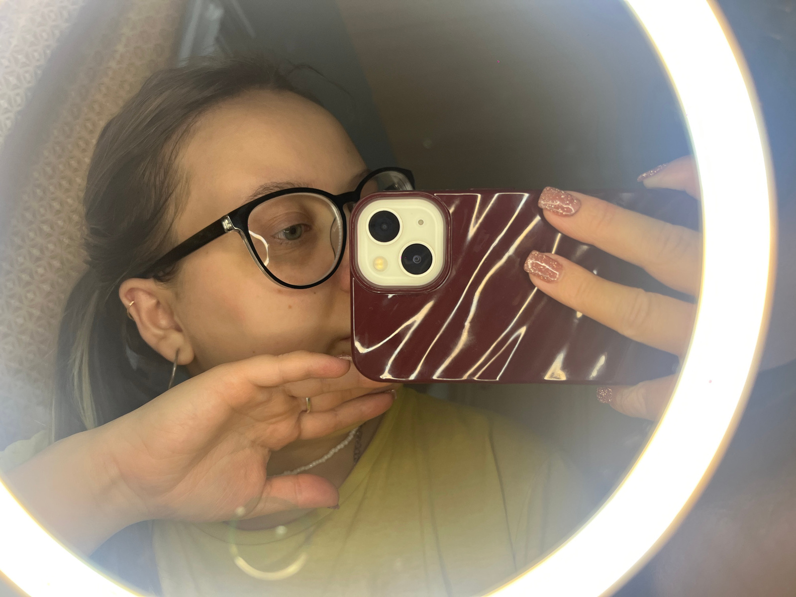 A woman is taking a selfie in a mirror illuminated by a ring light. She is wearing glasses and a yellow t-shirt. Her nails are painted with glitter. She is holding a cell phone with a burgundy case th…read more