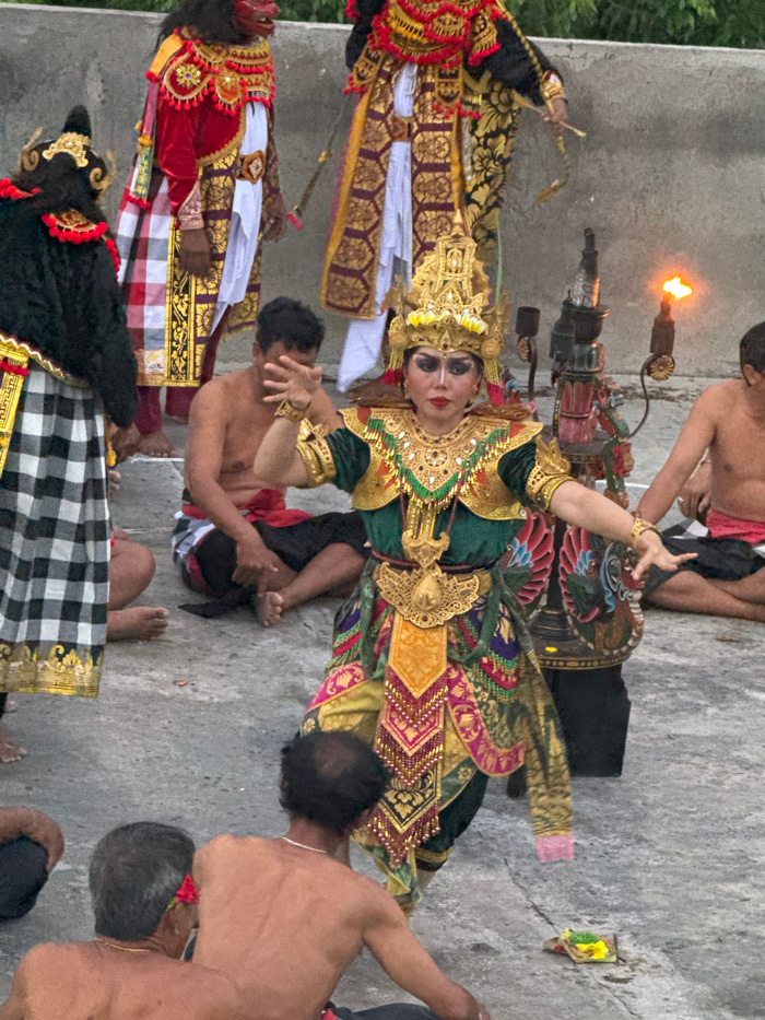 This image captures a traditional Balinese performance in an outdoor setting within Uluwatu, Indonesia. The ground is a light grey, textured concrete or paved surface. A central female performer is d…read more