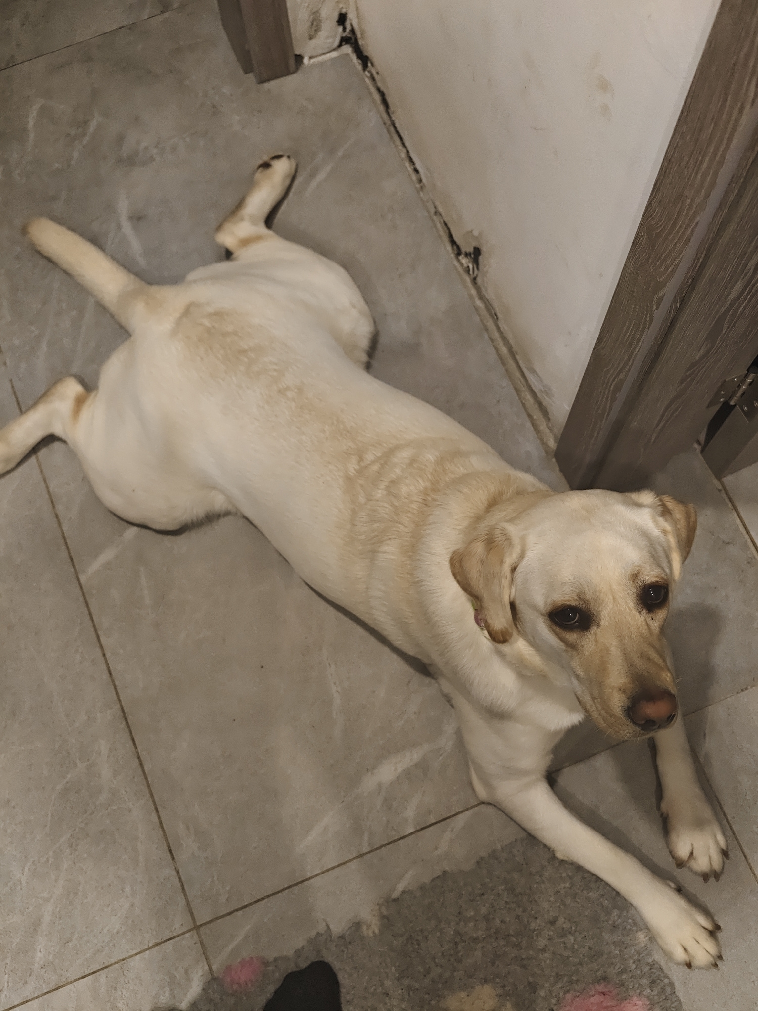 A yellow Labrador Retriever is lying on a light grey tile floor. The dog is positioned near a wall with cracked white paint and a wooden door frame. A section of patterned rug is visible in the bottom…read more