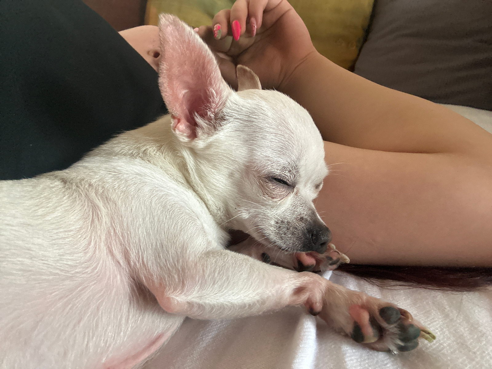 A white dog is sleeping on a person's lap. The dog is curled up and its head is resting on the person's hand. The person is wearing black pants and a white shirt. The dog's nails are black. The personβ¦read more