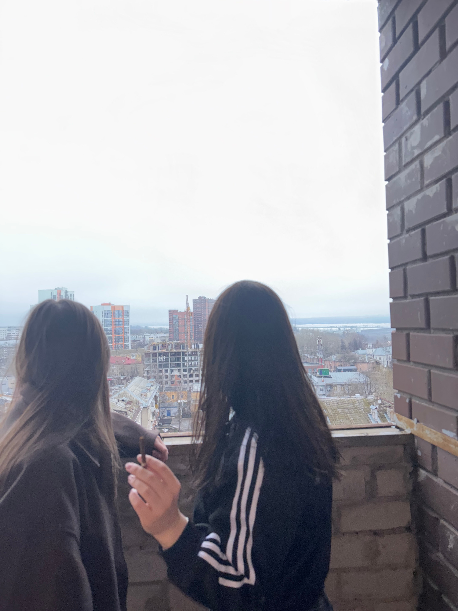 The image shows two people standing on the unfinished balcony of a high-rise building. The building appears to be under construction in Perm, Russia. The viewpoint overlooks a cityscape in overcast we…read more
