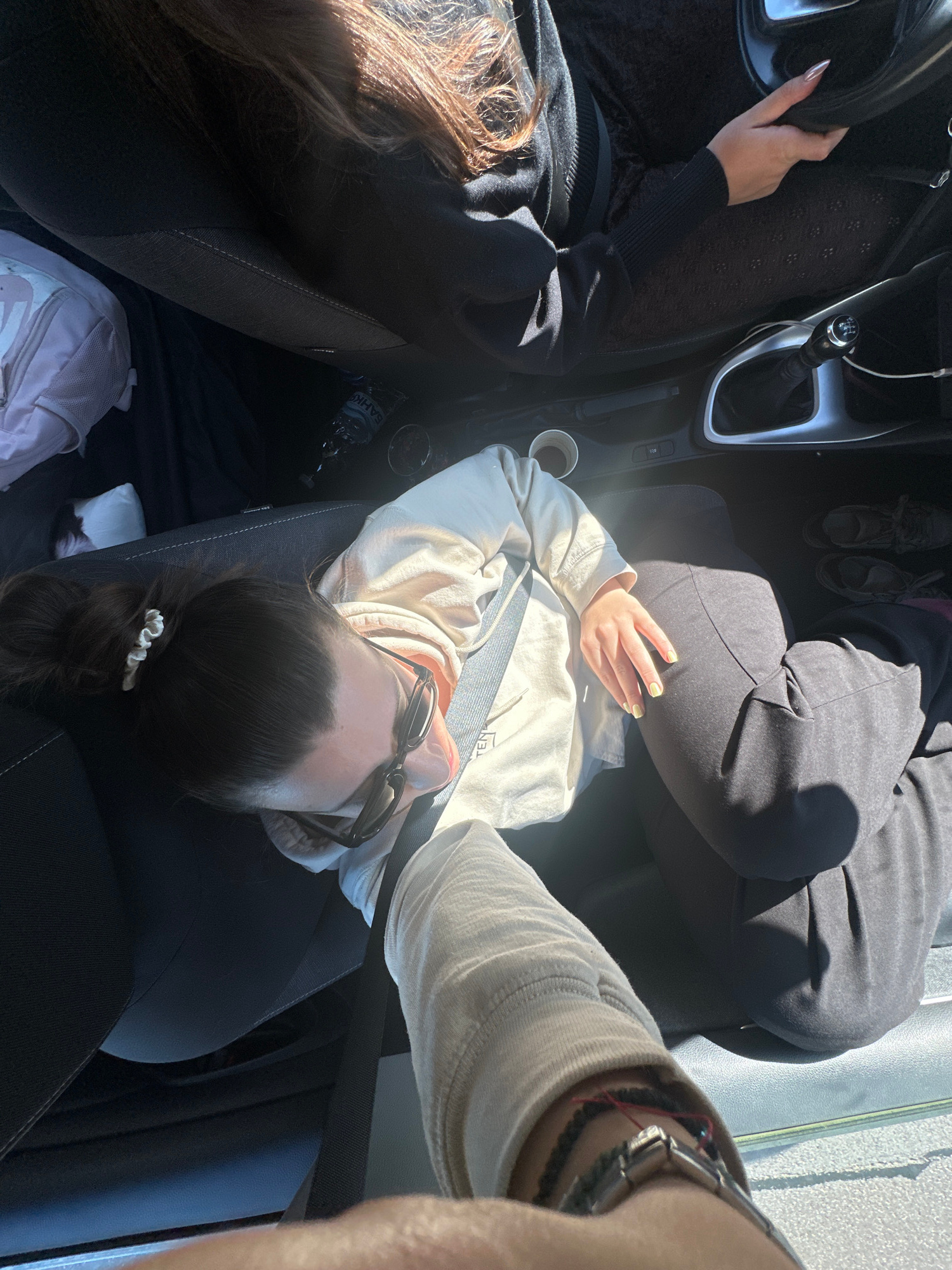 The scene depicts the interior of a car, with a woman in the passenger seat wearing a light-colored hoodie and sunglasses. She has brown hair tied back with a white scrunchie. The seatbelt is fastened…read more