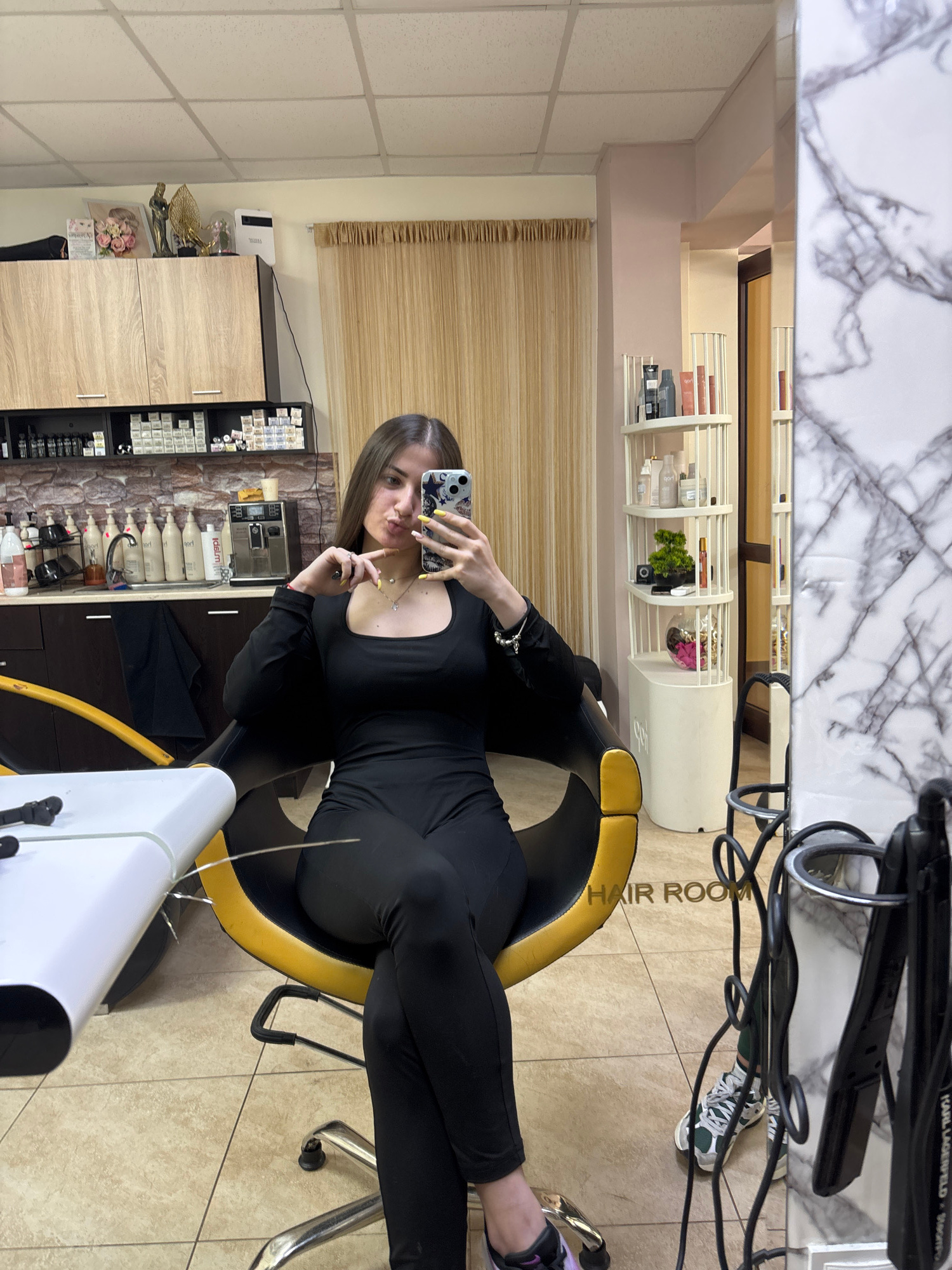 A young woman takes a mirror selfie in what appears to be a hair salon in Chirpan, Bulgaria. She is seated in a black and yellow salon chair, wearing a black long-sleeved jumpsuit or bodysuit with a k…read more