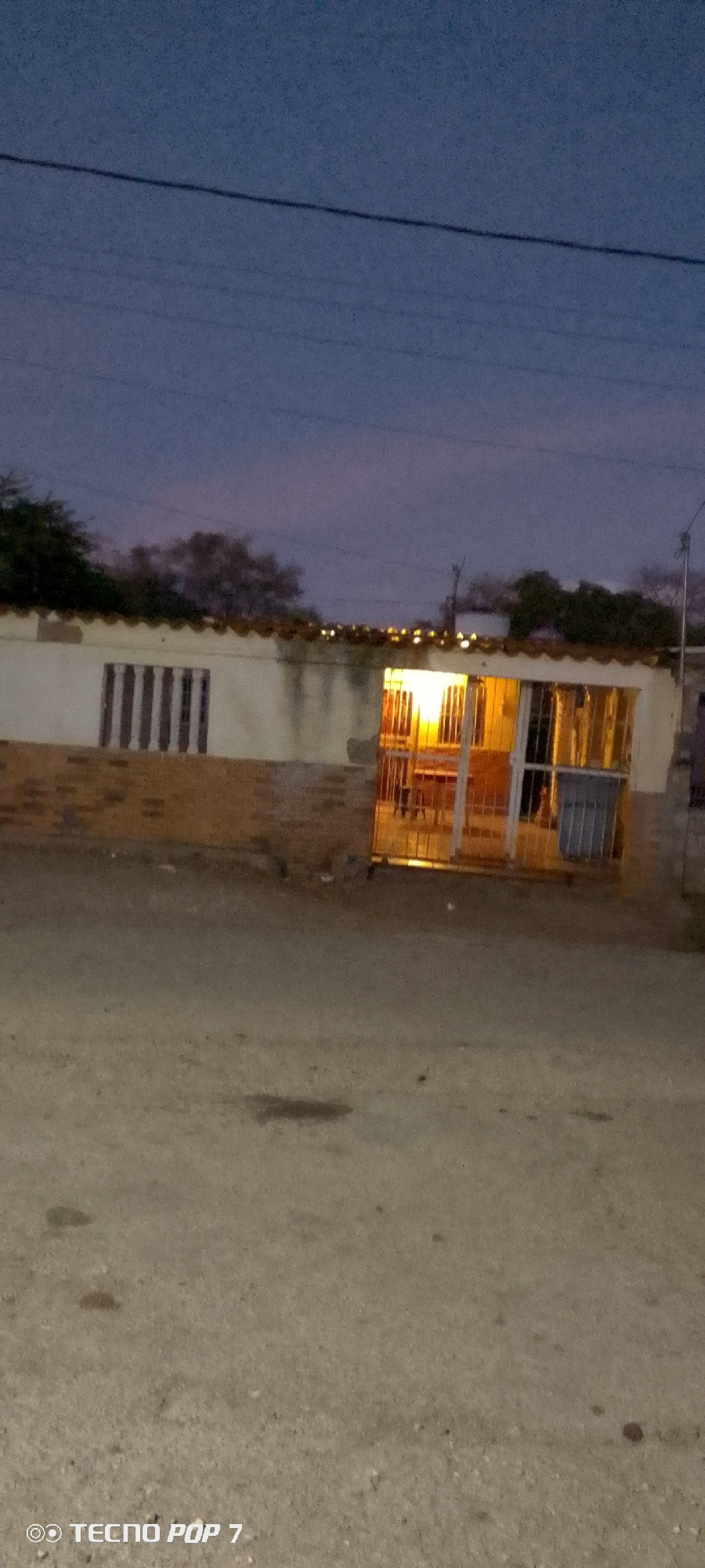 The image depicts a single-story building in Altagracia, Venezuela, at dusk. The building has a light-colored facade with a brick base and a corrugated metal or tile roof. A window with vertical bars…read more