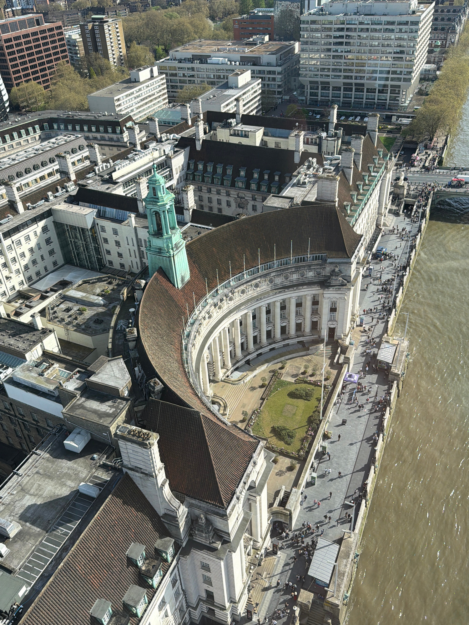 This is an aerial view of a section of London, United Kingdom, taken looking more or less straight down. In the foreground, rooftops of buildings in various architectural styles dominate the view. A p…read more