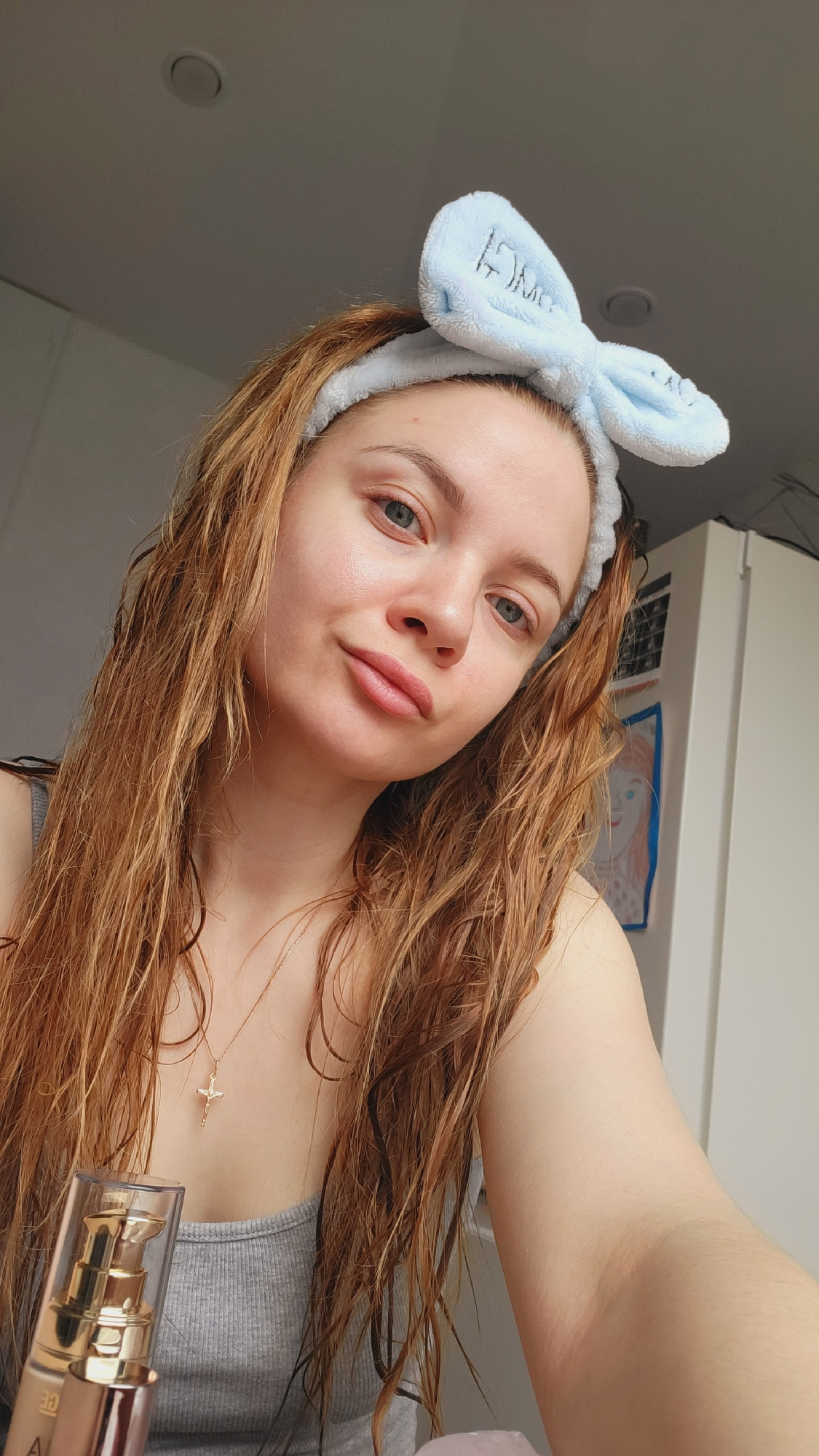 A young woman with light skin, light eyes, and wet reddish-brown hair wears a light blue headband with bunny ears. She is positioned at an angle, taking a selfie with her right arm extended. She is we…read more