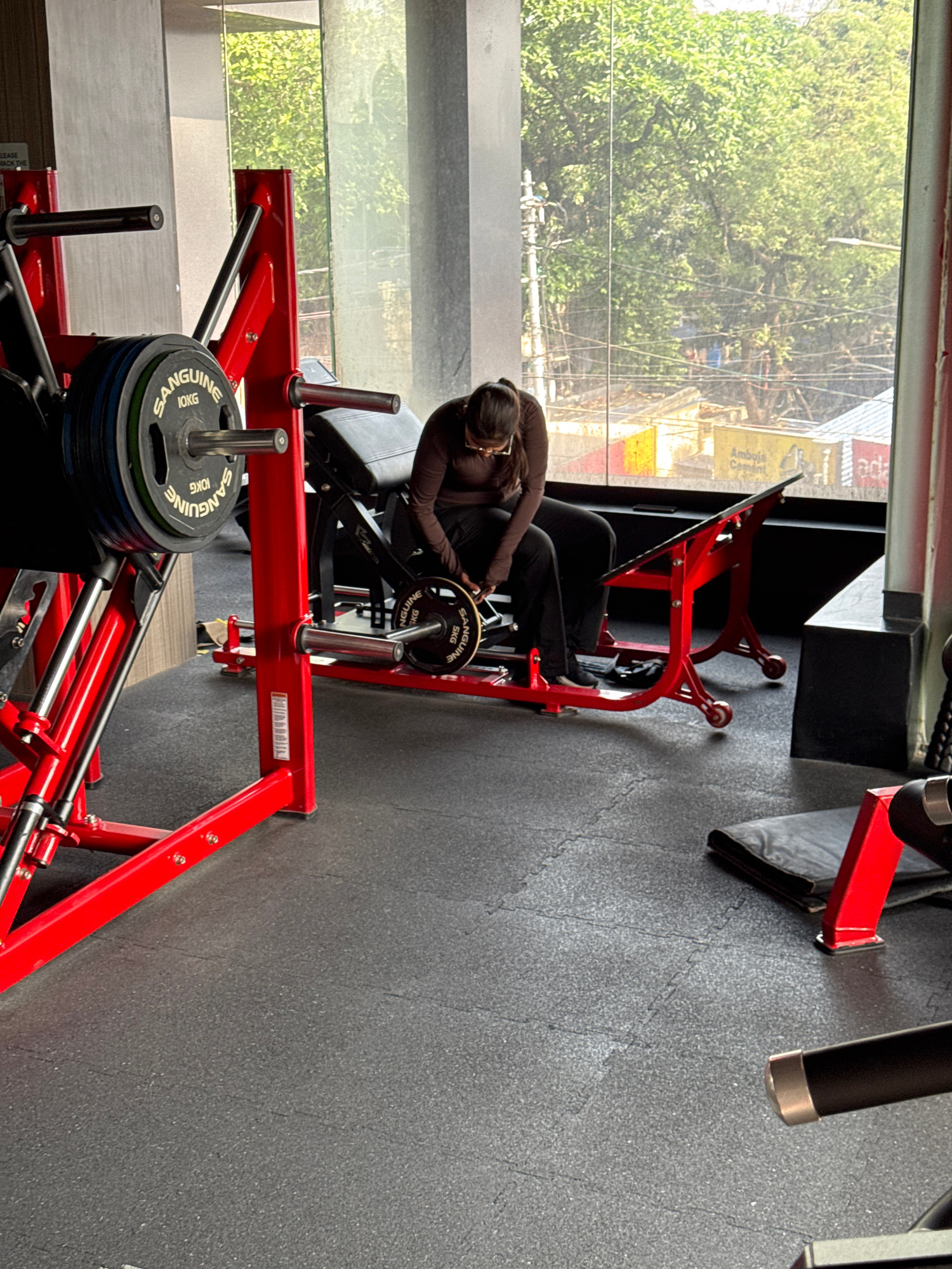A woman is exercising in a gym. She is seated on a red leg press machine, with black weights loaded onto the machine. The brand name “SANGUINE” is printed on the weights. The woman is wearing brown lo…read more
