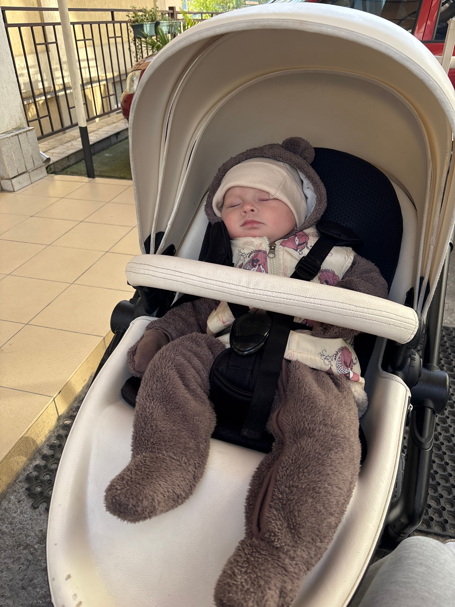 The image shows a sleeping baby in a stroller. The baby is wearing a light-colored hat with ears and a brown, furry snowsuit, secured with a black harness. The stroller is white with a black seat. Theβ¦read more