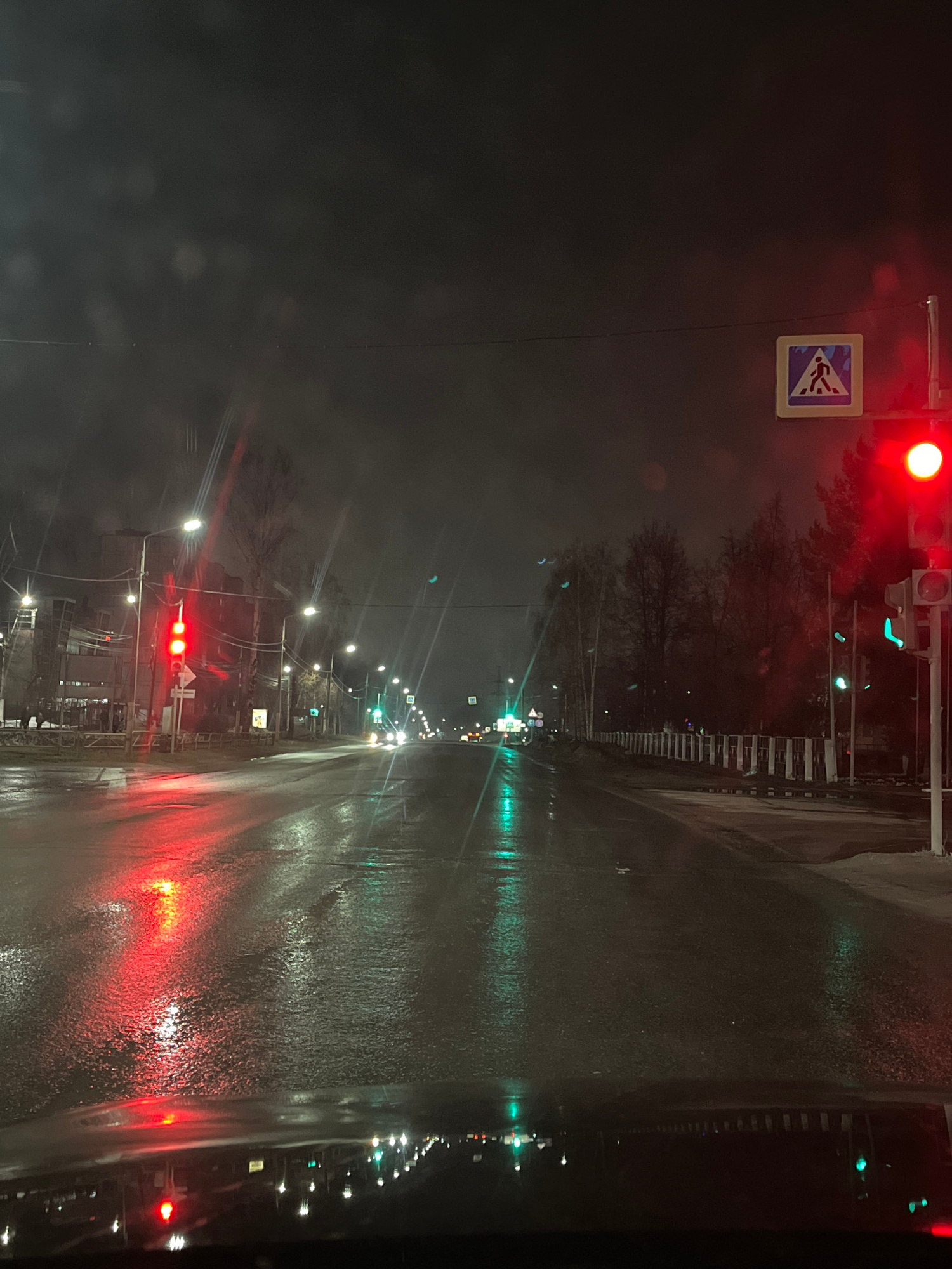 The image depicts a street scene at night in Chaikovsky, Russia. The road is wet, reflecting the lights of vehicles and street lamps. Traffic lights are visible, showing red lights. There is a pedestr…read more