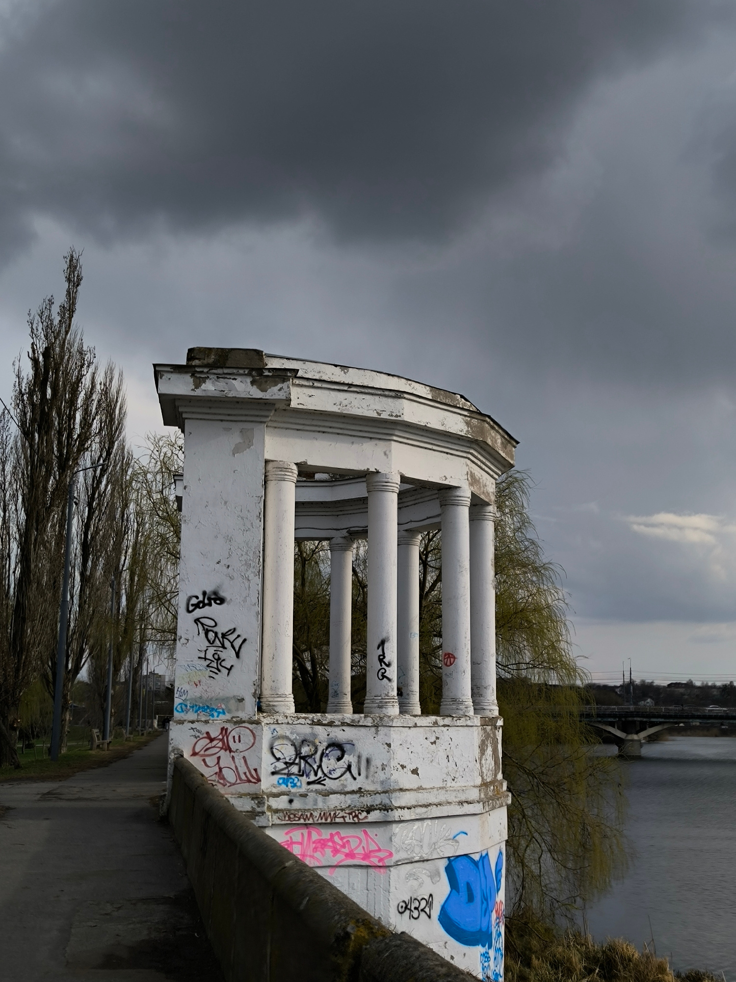 The image captures a white, derelict pavilion adorned with graffiti, located on the banks of the Southern Bug River in Vinnytsia, Ukraine. The pavilion's structure comprises pillars supporting a dilap…read more