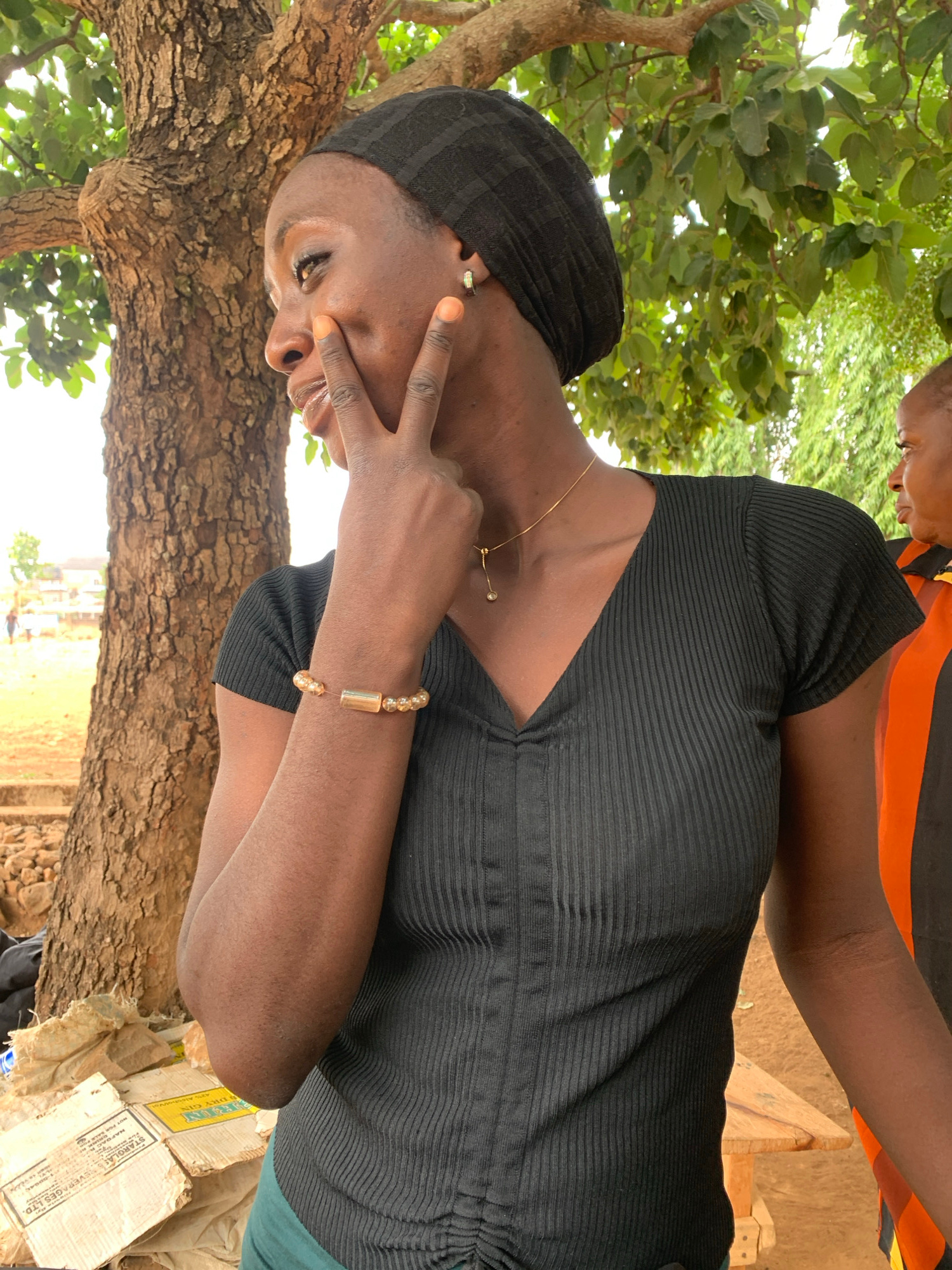 The image captures a woman outside, likely in Maigizo, Nigeria, based on the product details on the discarded packaging. She is wearing a black ribbed top, a black head covering, a gold necklace, and…read more