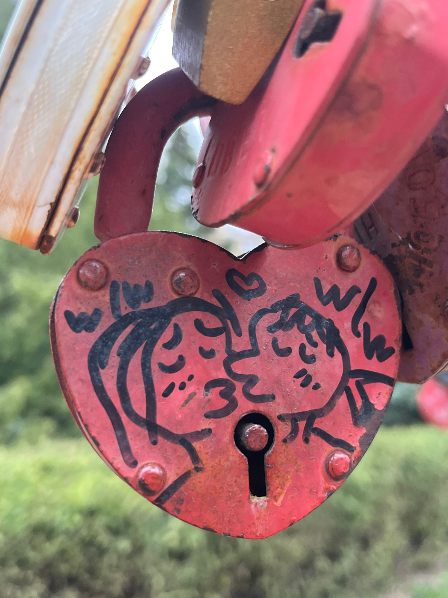 The image presents a close-up, diagonally oriented view of several weathered red padlocks, characteristic of a "love lock" tradition, against a soft-focus background of green foliage. The central focu…read more