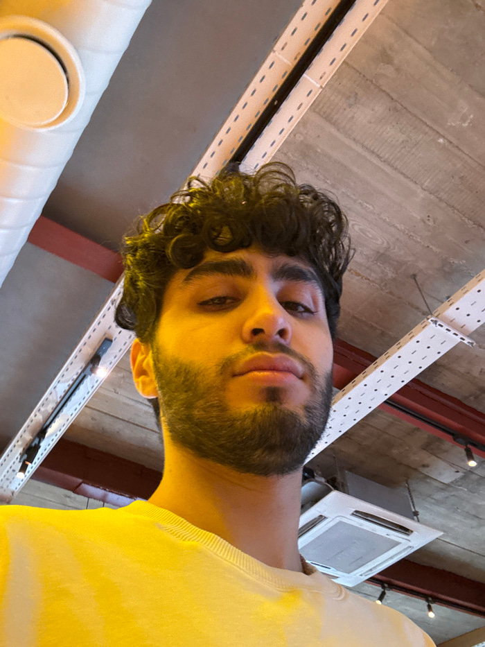 A selfie captures a man with curly dark hair and a beard looking down at the camera. He wears a yellow shirt. The perspective is from below, showing the ceiling with white and red structural elements.…read more