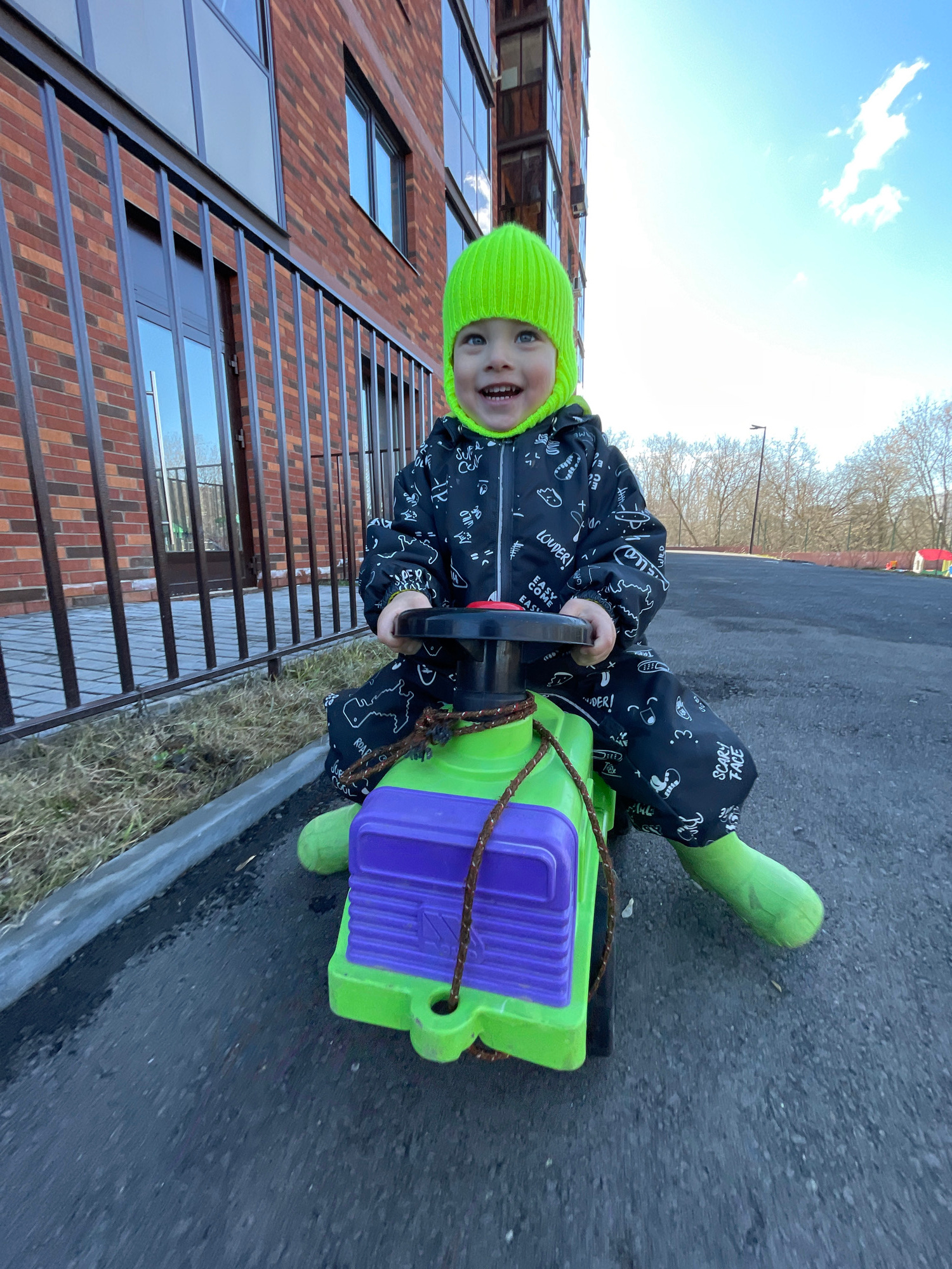 The image captures a young child outdoors, rotated 90 degrees to the left. **Subjects:** The primary subject is a smiling child, likely a toddler, wearing a bright neon green knitted beanie hat and matching neon green rubber boots. They are dressed in a black full-body suit or jumpsuit adorned with white patterns and text. In the background, a modern brick building with large rectangular windows is visible on the left, and bare trees are present in the upper right. **Objects:** The child is actively engaged with a brightly colored pull-along toy. The toy is predominantly neon green with a purple section on top, featuring a black handle and a brown rope for pulling. The ground beneath the child and toy is a dark asphalt or paved surface, with some patches of dry grass along a curb next to the building. The sky is bright blue with a few white clouds. **Activity or event taking place:** The child is sitting on or beside their pull-along toy, looking directly at the camera with a wide, joyful smile, suggesting an active playtime moment. **Notable details:** The scene depicts a bright, clear day, likely late winter or early spring given the bare trees. The child's warm attire (hat, jumpsuit, boots) also suggests cooler weather. The modern architectural style of the building provides a distinct urban or suburban setting. The child's expression conveys happiness and excitement. The location context is Izhevsk, Russia. **Visible text:** Text visible on the child's jumpsuit includes "SCARY FACE", "LOUDER!", "EASY COME EASY", "ROAR", "WILD", and the number "3". | Open Wire