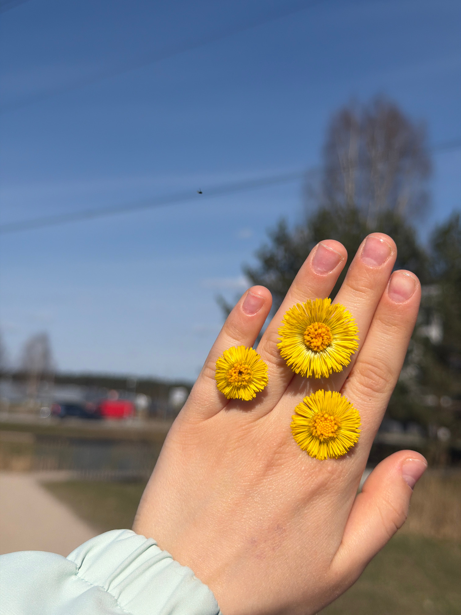A hand with three yellow flowers on it is shown against an outdoor backdrop. The flowers are arranged on the back of the hand, one on the middle finger, one on the ring finger, and one on the pinky fi…read more