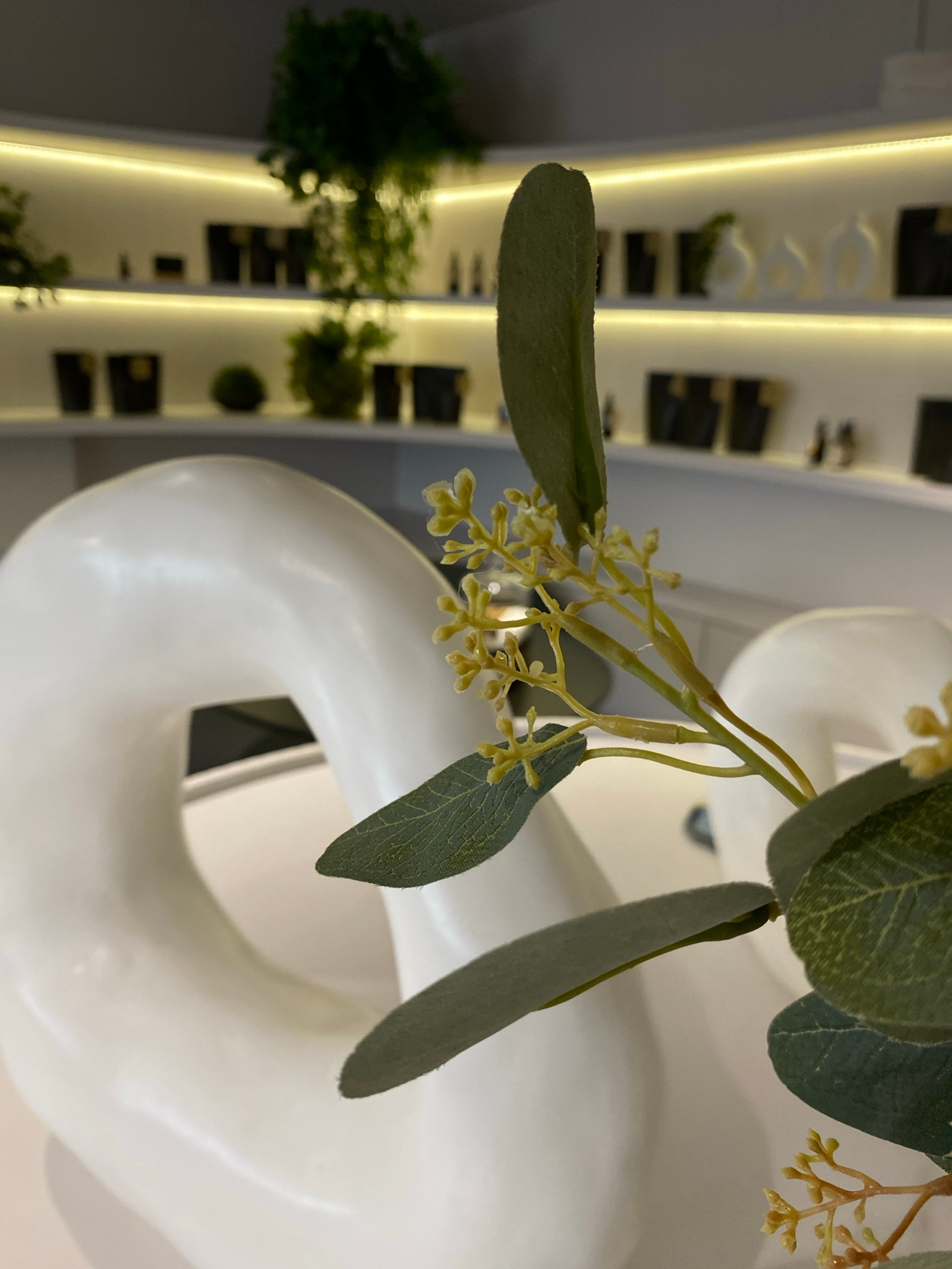The image features a close-up of artificial eucalyptus leaves and budding flowers positioned against a white, sculptural object with a toroidal shape. The background suggests an interior space with ve…read more