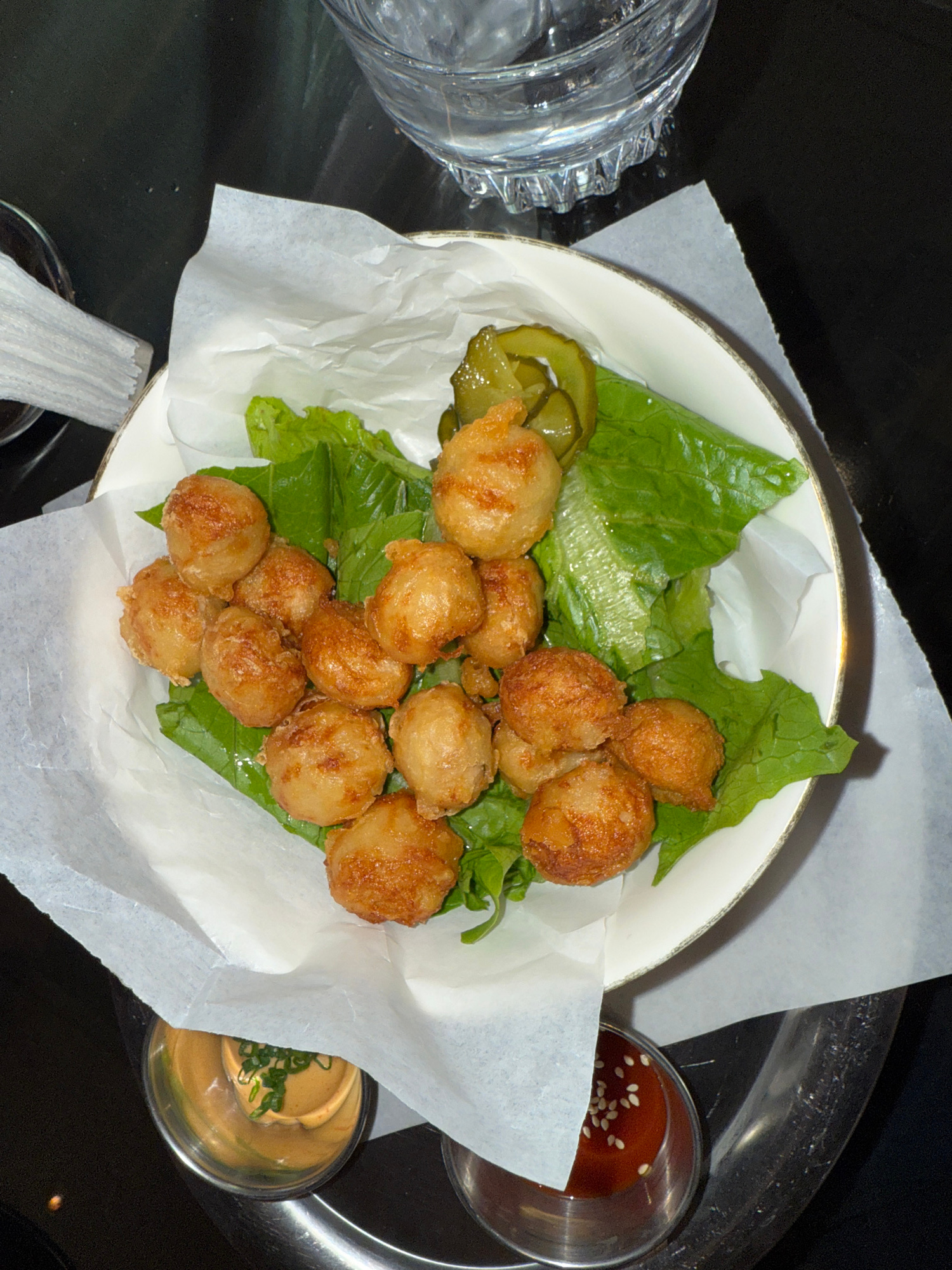 An overhead shot captures a serving of golden-brown fried food presented in a white bowl with a gold rim. The bowl is lined with crumpled white parchment paper and several vibrant green lettuce leaves…read more