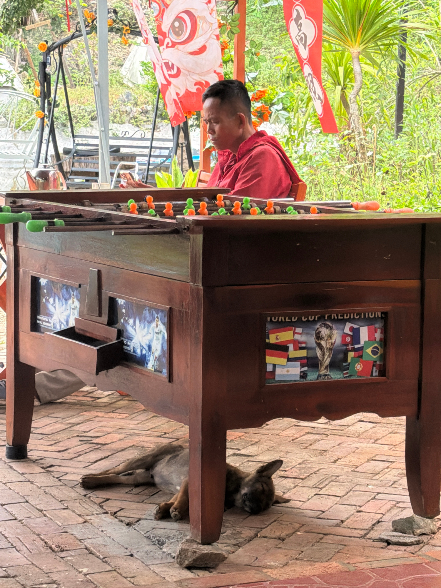 A man in a red shirt is playing foosball on an outdoor patio. The foosball table has a "World Cup Prediction" graphic on its side, along with soccer-themed decorations. A small dog is sleeping near th…read more