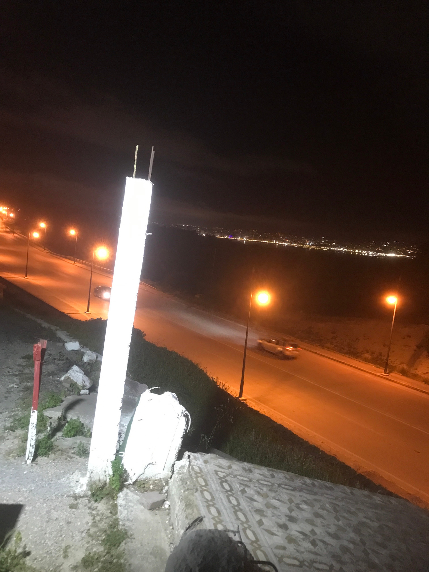 The image captures a nighttime scene in an unknown urban environment. A road stretches into the distance, illuminated by a series of streetlights. A car's headlights are visible further along the road…read more