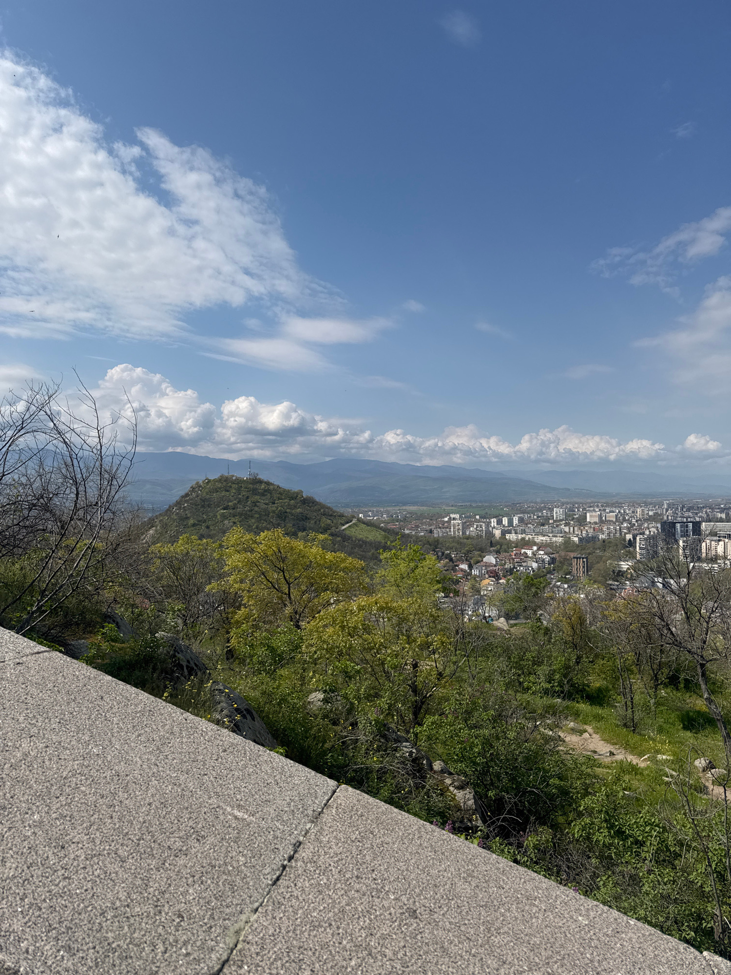 The image shows a view from Nebet Tepe in Plovdiv, Bulgaria, looking out over the city. In the foreground, a concrete retaining wall is visible. A mix of trees and vegetation partially obscures a view…read more