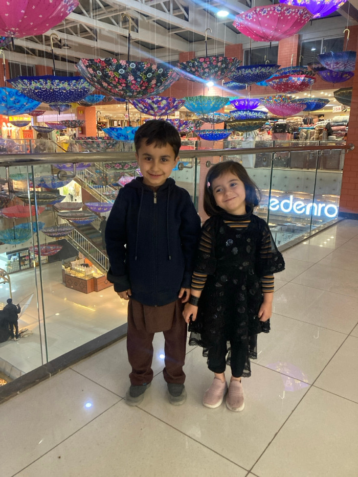 This image depicts two young children standing on an upper floor of a shopping mall in Quetta City Tehsil, Pakistan. **People:** In the foreground, a boy approximately 5-7 years old stands on the lef…read more