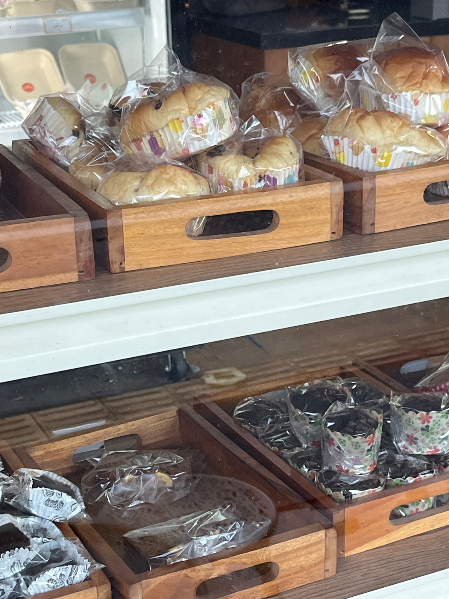 The image shows a display case of baked goods in what appears to be a bakery in Unknown, Indonesia. The baked goods are individually wrapped in clear plastic and arranged in wooden trays. The left sid…read more