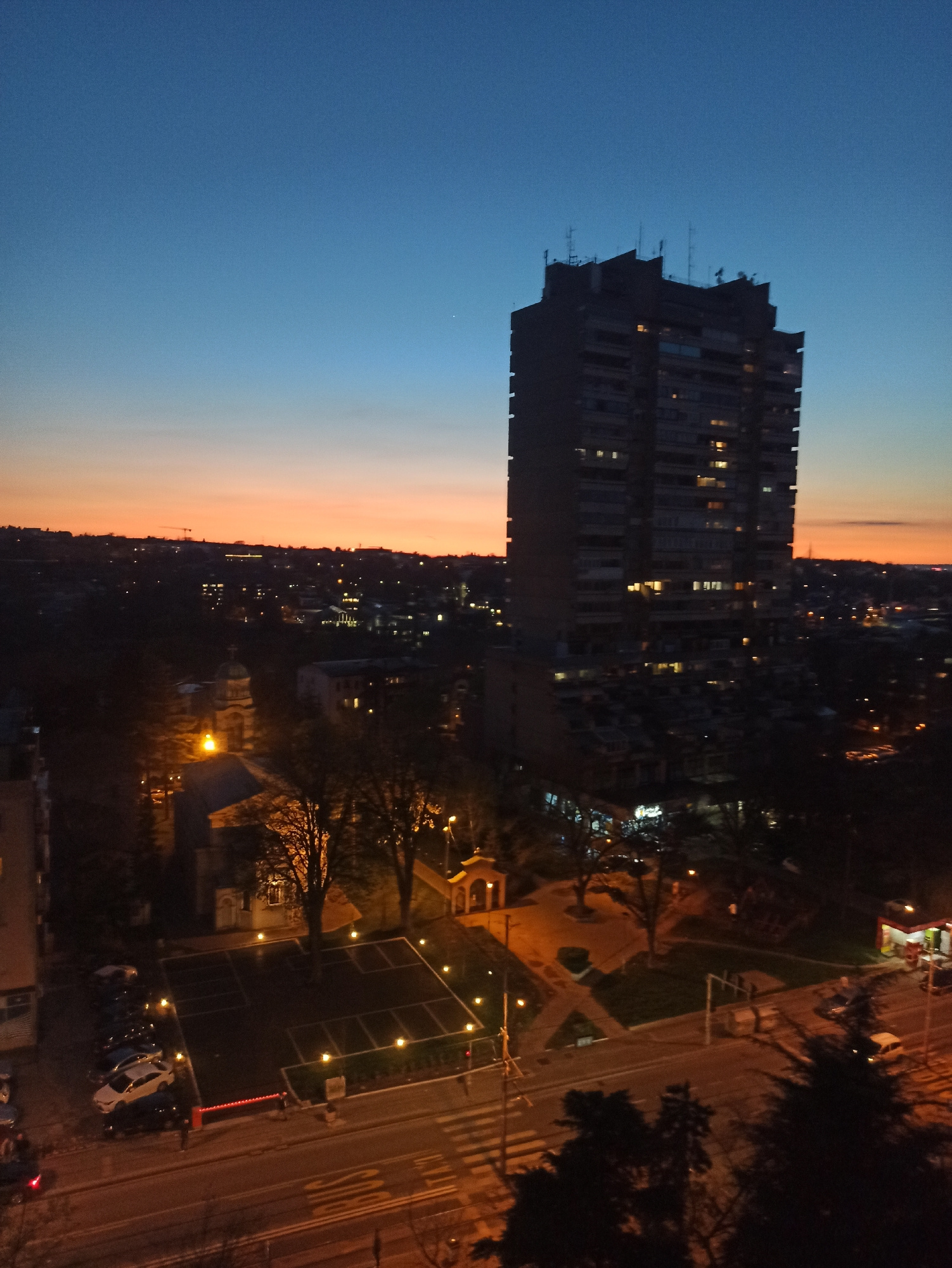 The image depicts a high-angle view of a cityscape at twilight. A tall, rectangular building dominates the left side of the frame, its windows reflecting the remaining light. The sky transitions from…read more