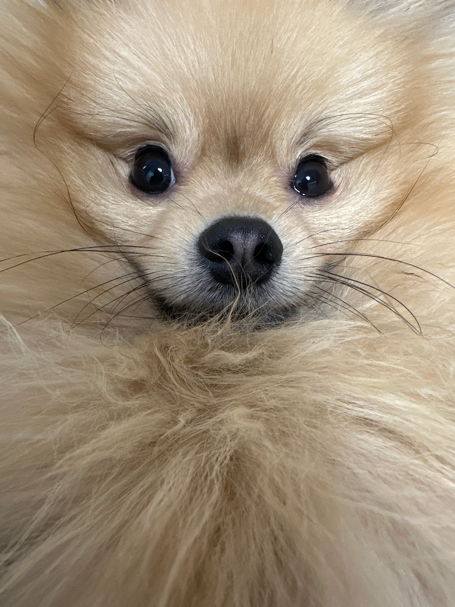 A close-up, upside-down photograph shows the face of a cream-colored Pomeranian dog. The dog's eyes are dark and glossy, and its nose is black and slightly damp. Long, thin whiskers extend from the mu…read more