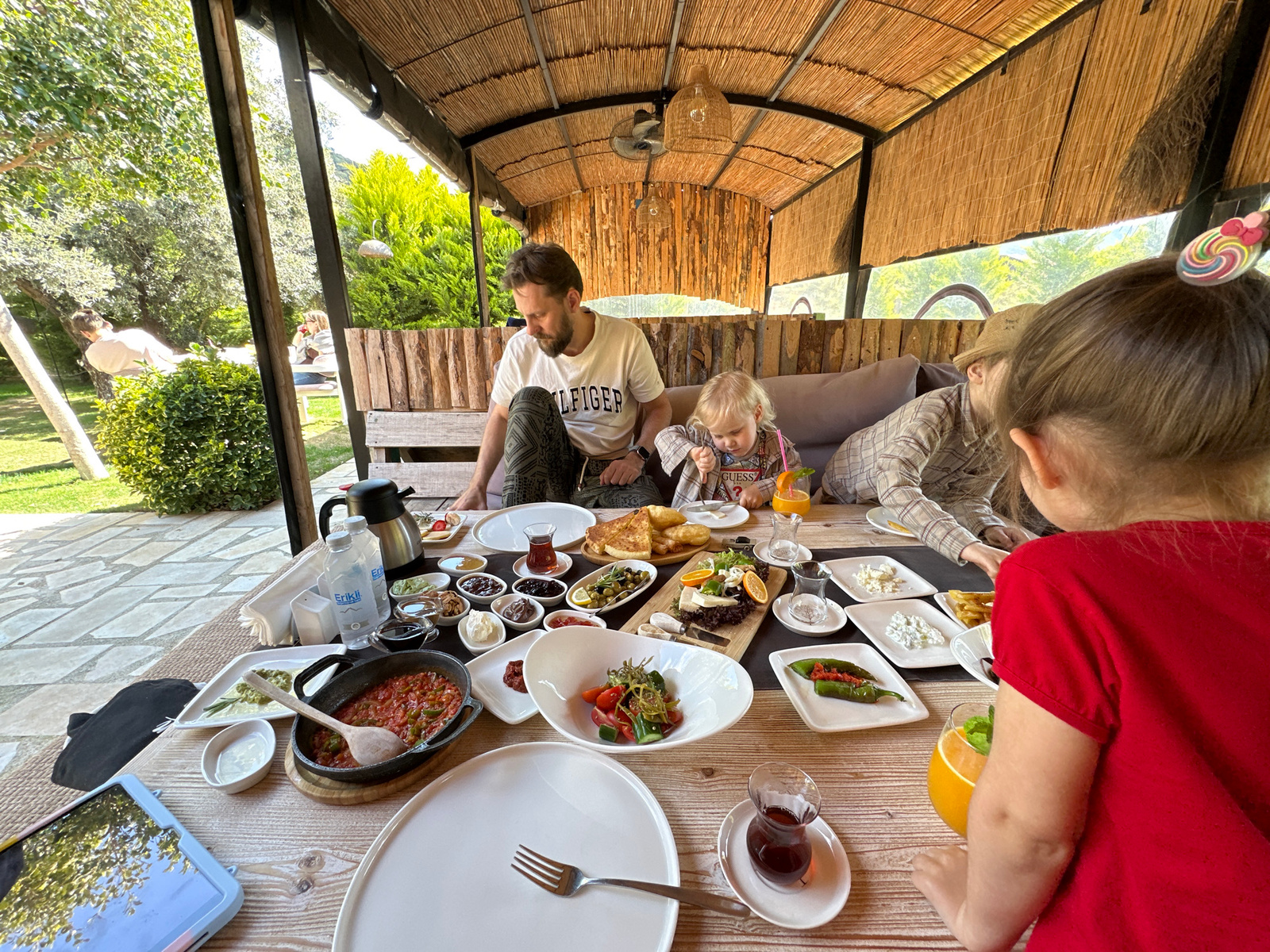 The image captures a family breakfast scene, likely in a restaurant or a private outdoor dining area with a roof, near Kaş, Turkey, as suggested by the setting. A wooden table is laden with an extensive Turkish breakfast spread, including various dips, cheeses, olives, salad, peppers, and dishes such as menemen (tomato and pepper dish). The table also features Turkish tea glasses and orange juice. A man wearing a Hilfiger t-shirt is seated with a young child. Two other individuals are partially visible, one of whom is a young girl wearing a red shirt. The family appears to be engaged in eating and drinking, enjoying their breakfast. Outside the dining area, there's greenery and a glimpse of a building, suggesting a garden or park setting. The structure has a rustic roof made of woven material, offering shade and creating an intimate dining space. A ceiling fan is visible on the ceiling. | Open Wire
