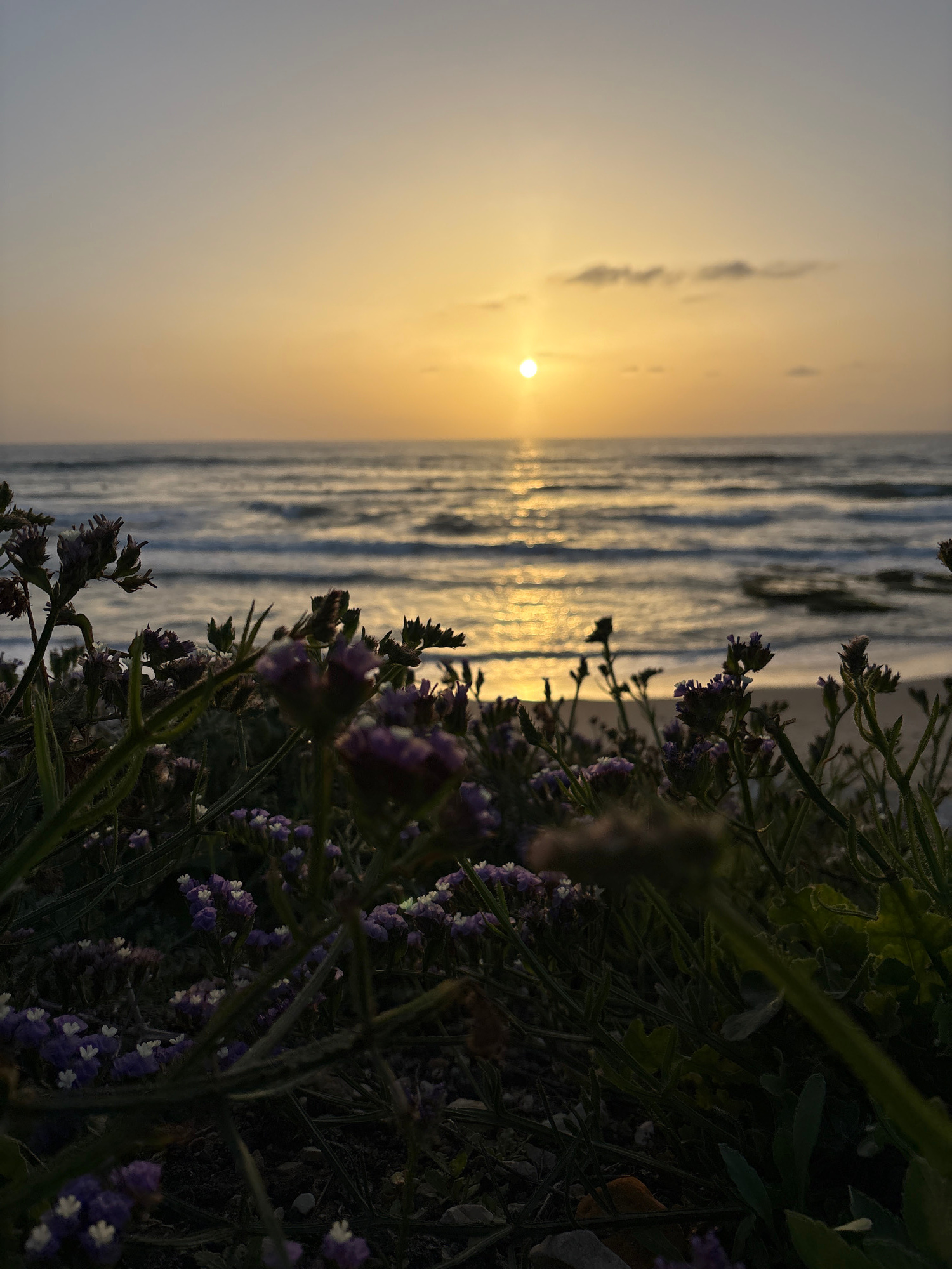 A view of the ocean at sunset, taken from the edge of a cliff or dune. The sky is a gradient of yellow and gray. The sun is low on the horizon. Waves are visible in the ocean. Purple and white flowers…read more