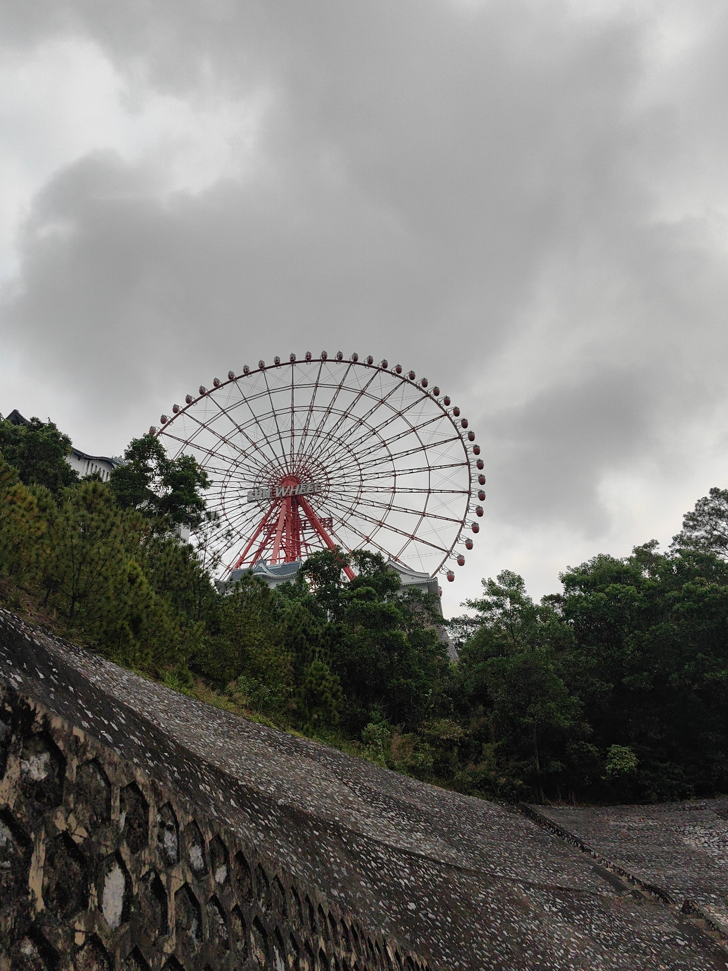 The image shows a large red and white Ferris wheel in Hong Gai Ward, Vietnam, partially obscured by trees. The Ferris wheel sits atop a hill. The sky is overcast. A stone retaining wall is in the fore…read more