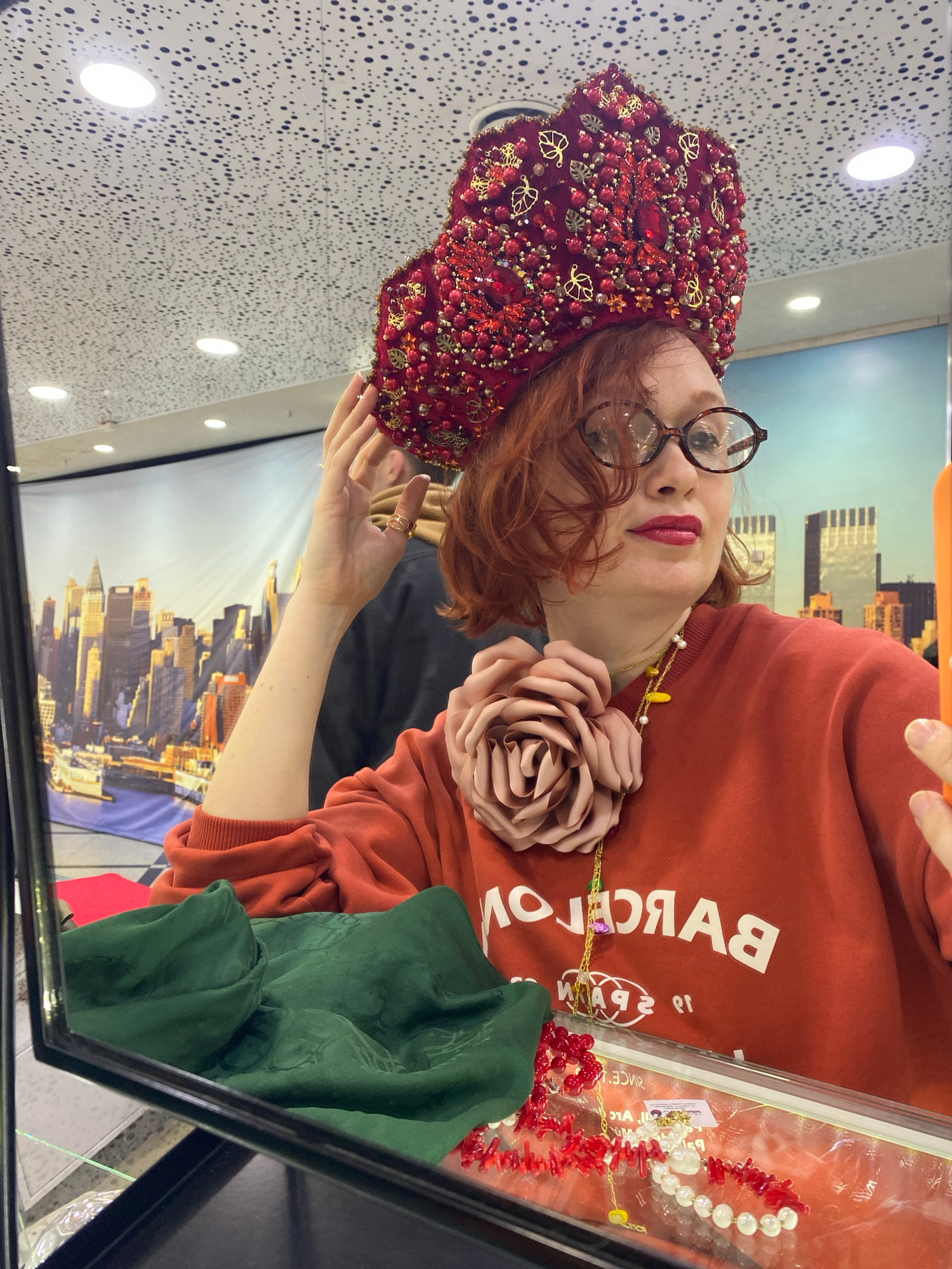 A woman is reflected in a glass case, likely a display in a store. She has reddish-auburn hair, wears round glasses, red lipstick, and a red patterned head covering with decorative stones. She is wear…read more