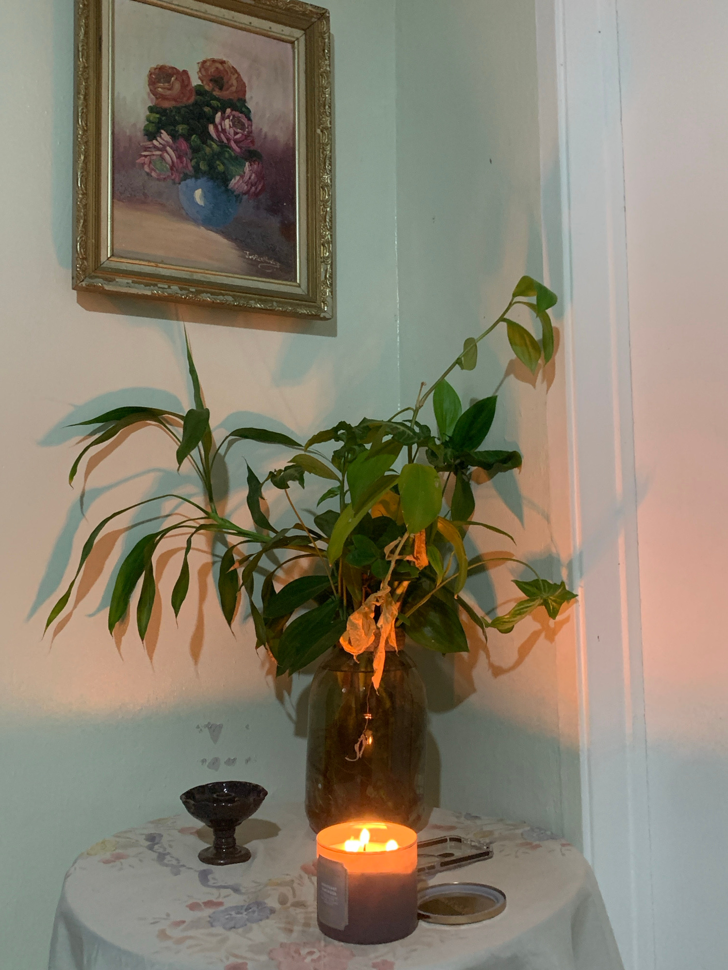 A framed floral painting hangs on a light-colored wall, adjacent to a vase of green plants placed on a small, round table with a floral patterned tablecloth. A lit candle is positioned on the table ne…read more