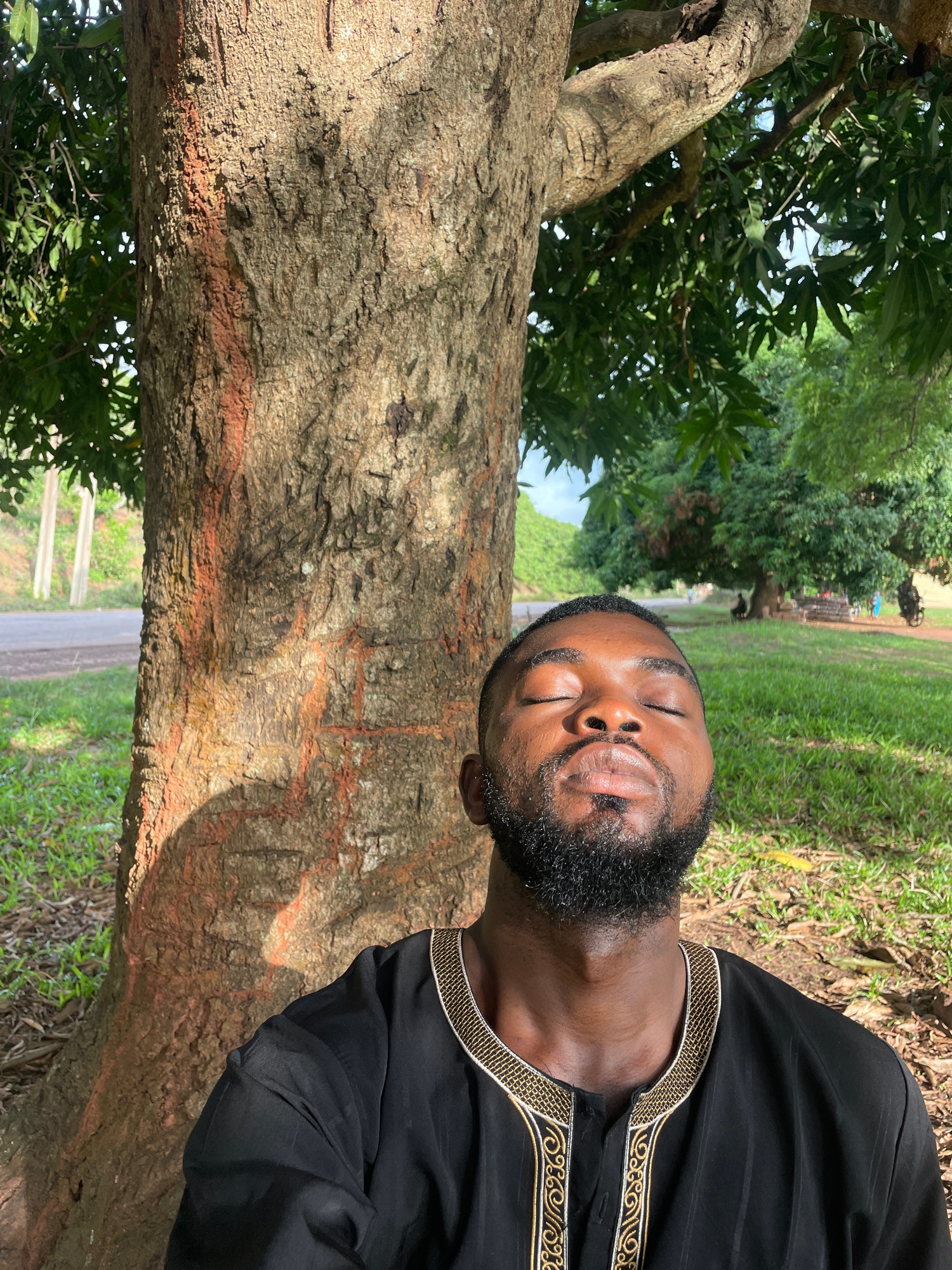 A man with closed eyes leans against a tree in Ogbe, Nigeria. He has dark skin, a beard, and wears a black shirt with gold trim around the collar. The tree has rough, brown bark. In the background, th…read more