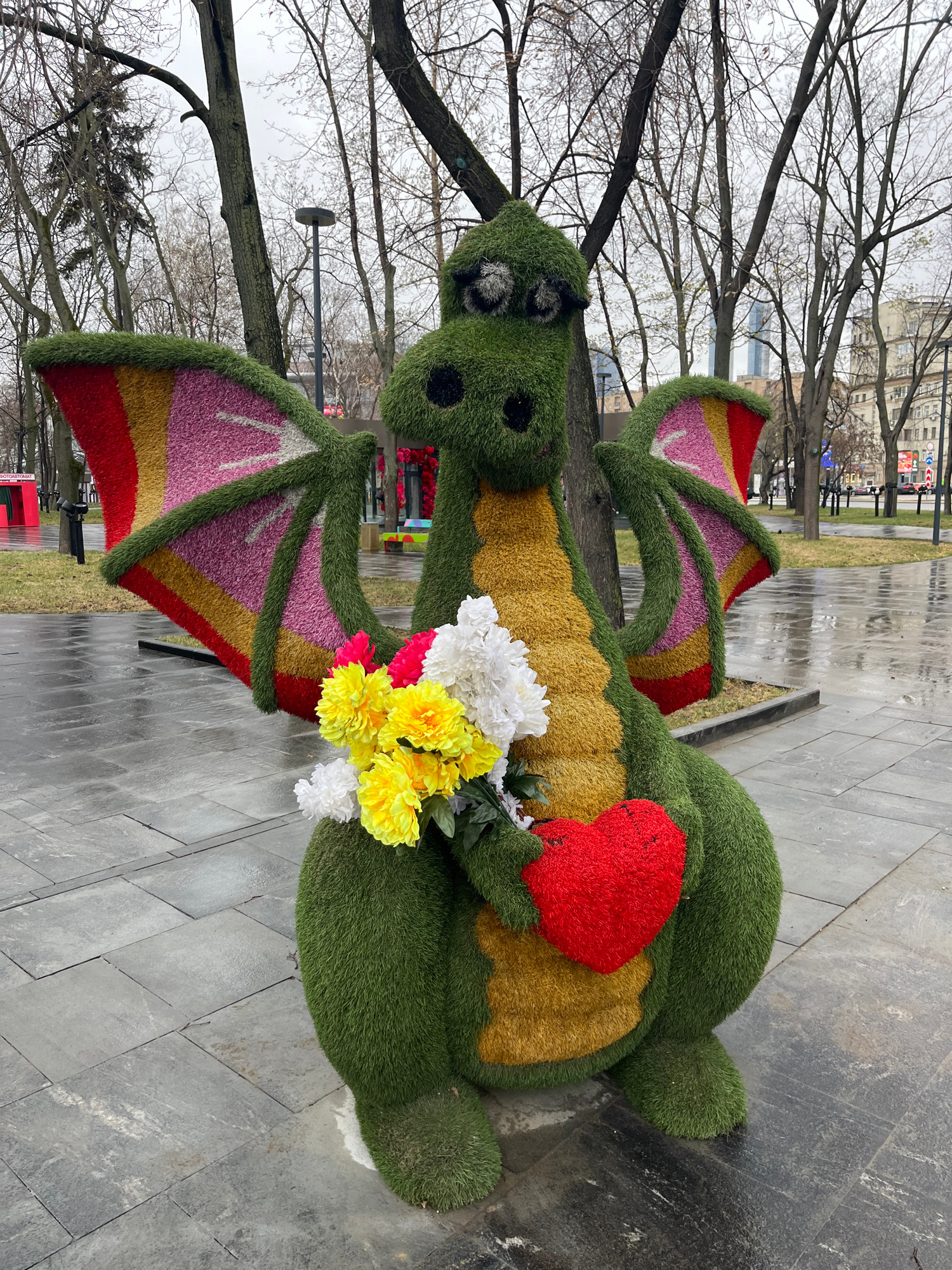 The image shows a topiary dragon figure holding flowers and a heart, located on a paved area. The dragon is made of green grass-like material, with a yellow belly. Its wings have bands of red, yellow,…read more