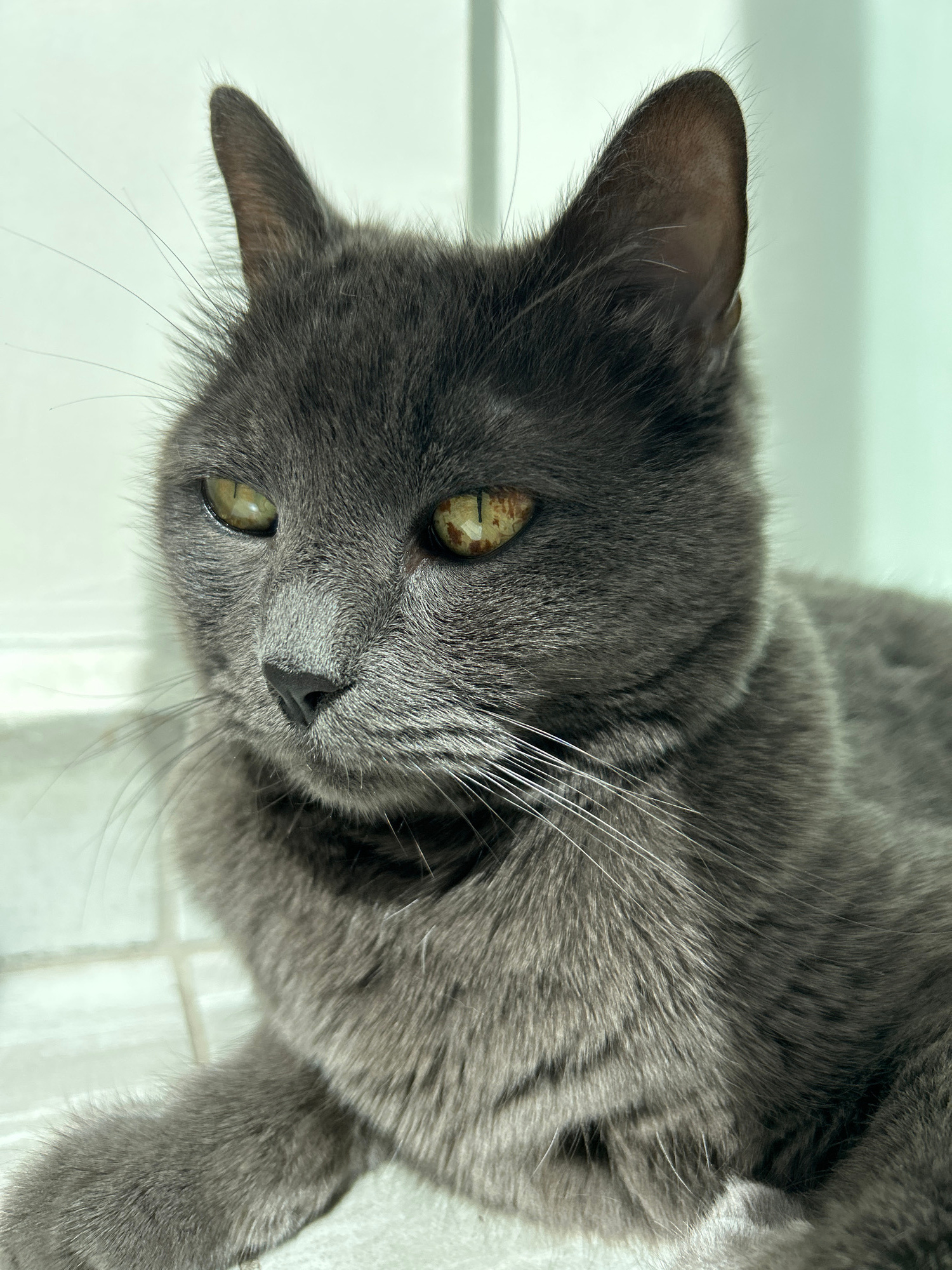 A close-up, angled, and somewhat rotated shot depicts a gray cat with short fur lying on a white surface. The cat is positioned in a way that its head is closest to the viewer, angled slightly upwards…read more