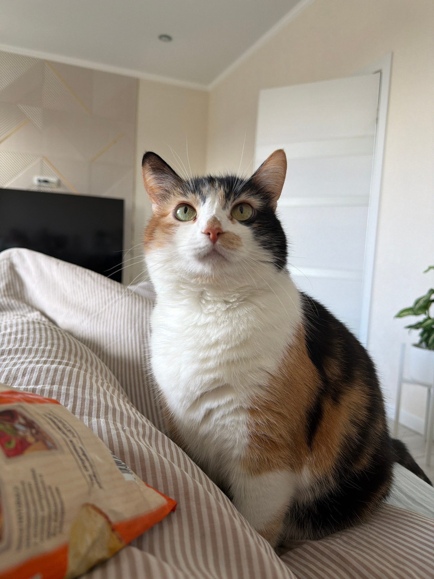 A calico cat is lying on a striped bedspread indoors. A package sits on the bedspread near the bottom right corner of the frame. A television is visible against a wall in the background. A white door…read more