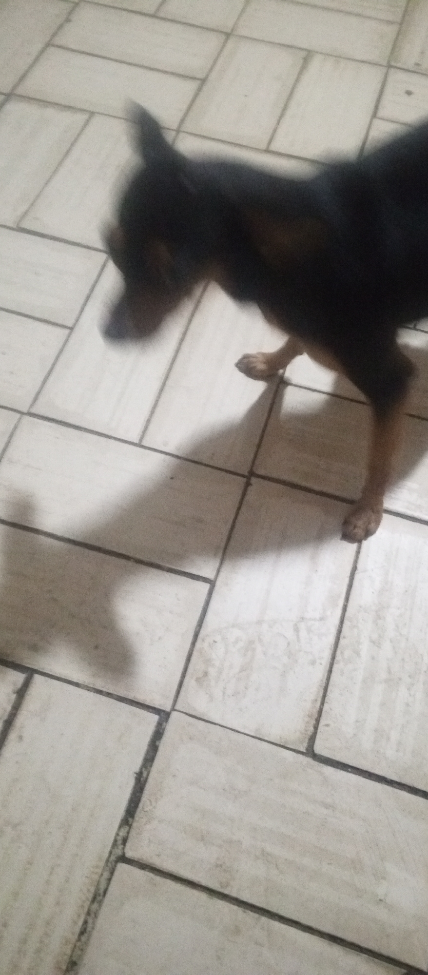 A blurry image depicts a small, short-haired black and tan dog standing on light-colored tile flooring. The dog's body is primarily black, with tan coloring on its legs. The dog appears to be in motioβ¦read more