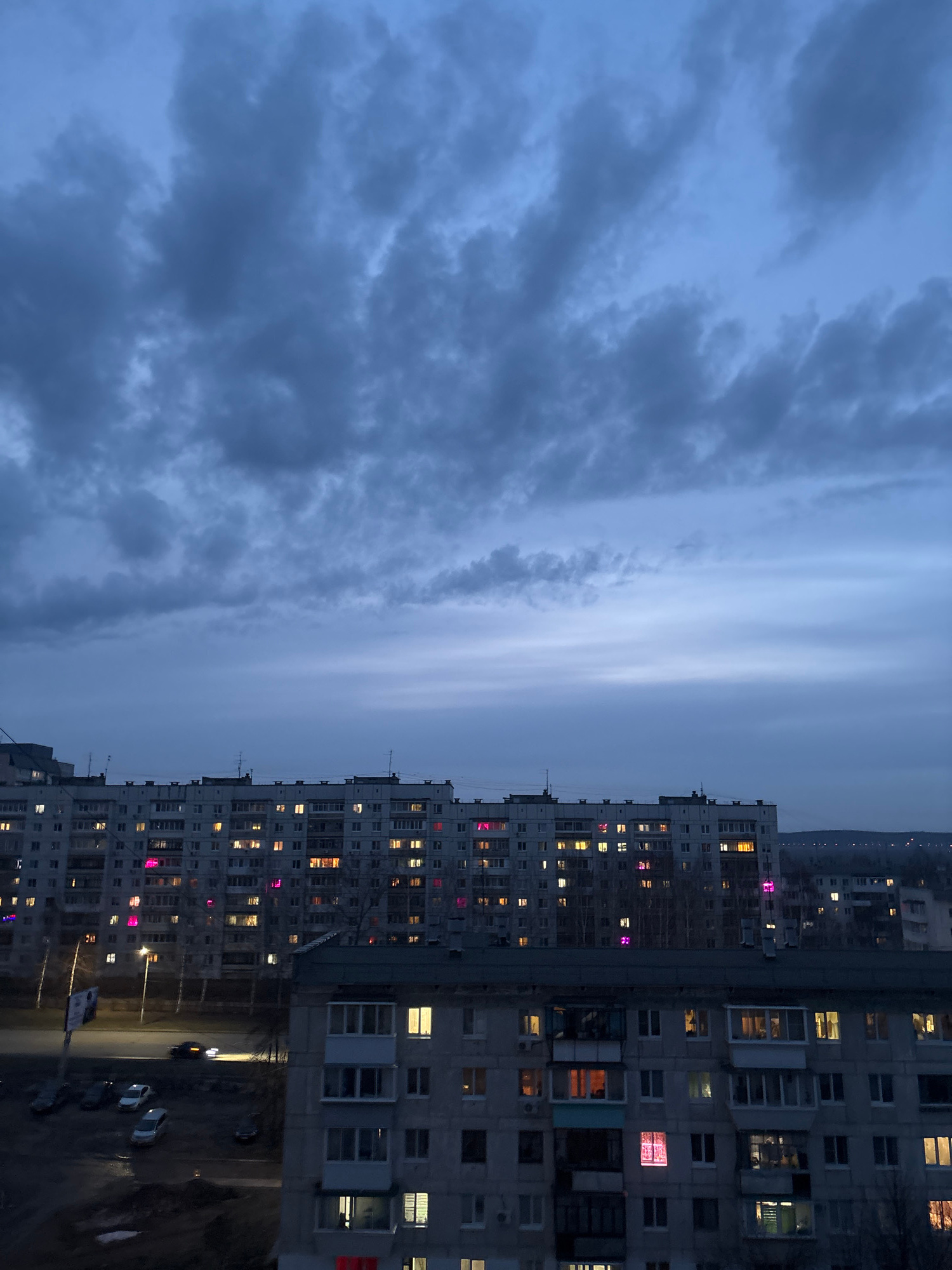 The image presents an evening scene in what appears to be a residential area, possibly in or around the city of Chaikovsky, Russia. The sky is heavily overcast with dark, textured clouds dominating th…read more