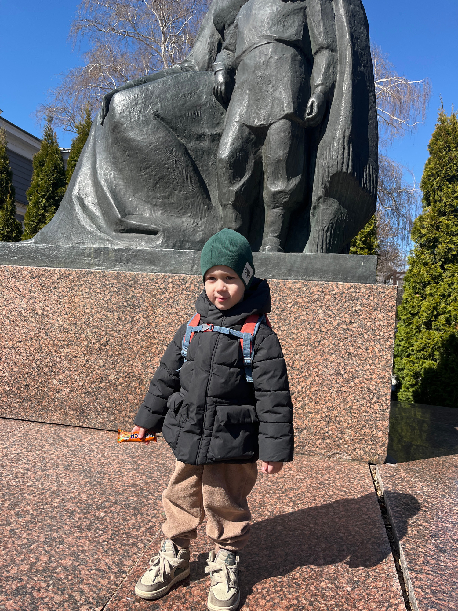 A young boy in a black puffer jacket, tan pants, and grey sneakers is standing on a brown-speckled granite surface next to a large, dark-colored, abstract sculpture. The boy wears a green beanie and has a small snack bar in his hand. The sculpture is positioned on the left side of the image, contrasting with the bright blue sky and bare branches of trees in the background. To the right, behind the boy and sculpture, is a line of evergreen trees. The photograph appears to be taken at an outdoor location. Based on the sculpture style, the scene is likely located at Lenin Memorial in Ulyanovsk, Russia. | Open Wire