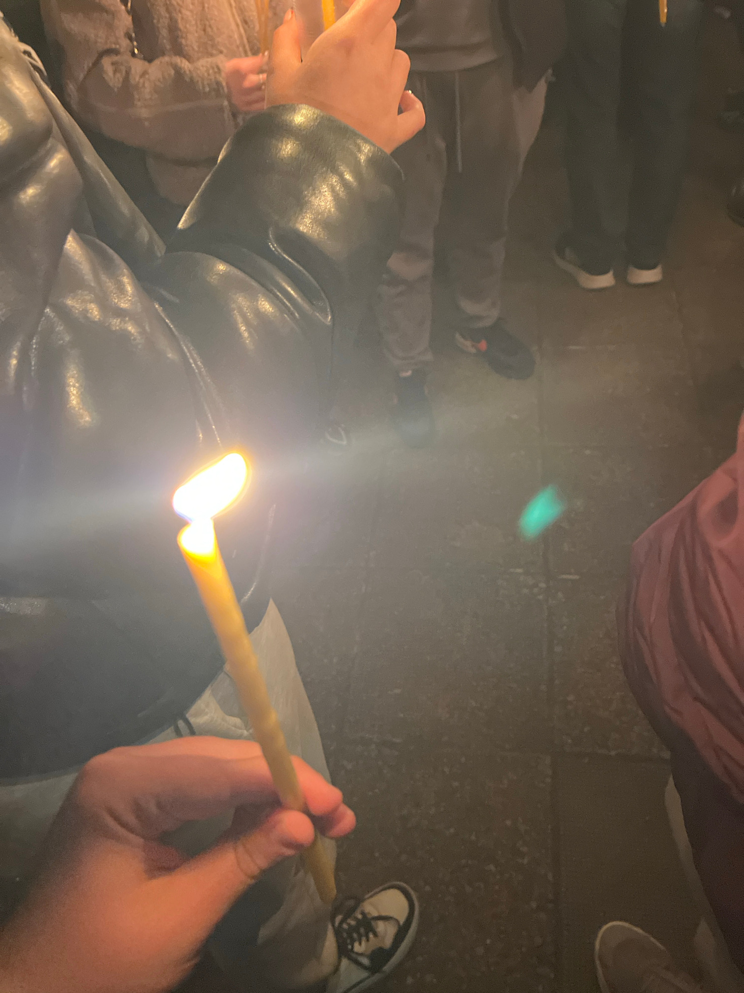 An overhead shot depicts a lit incense stick held between a person's fingers. The stick emits a bright flame at one end. The person is wearing a black leather jacket. Several other people are visible…read more