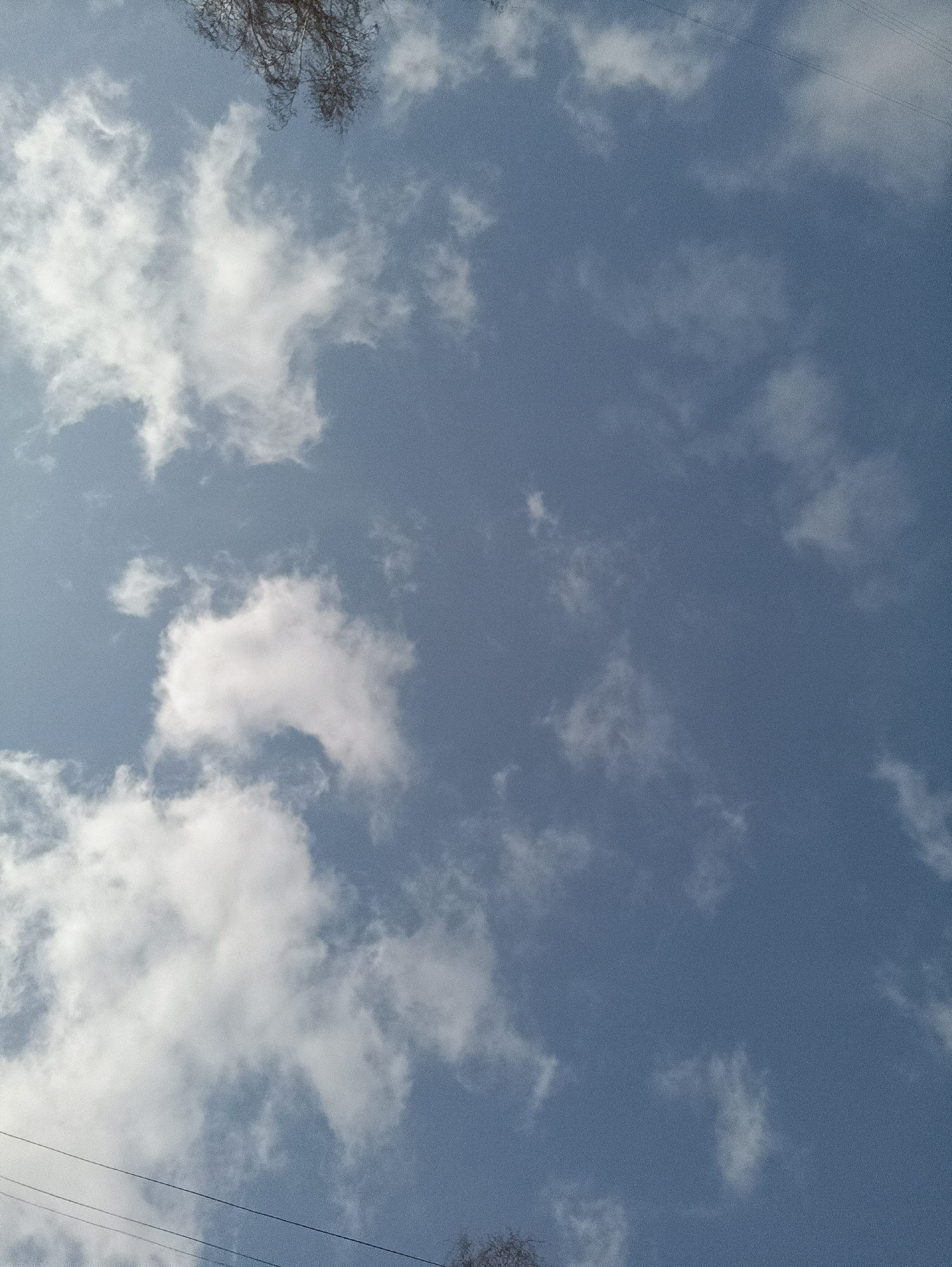 The image shows a daytime sky with scattered white cumulus clouds against a blue background. A thin, leafless treetop and power lines are visible in the lower left corner, and another treetop appears…read more