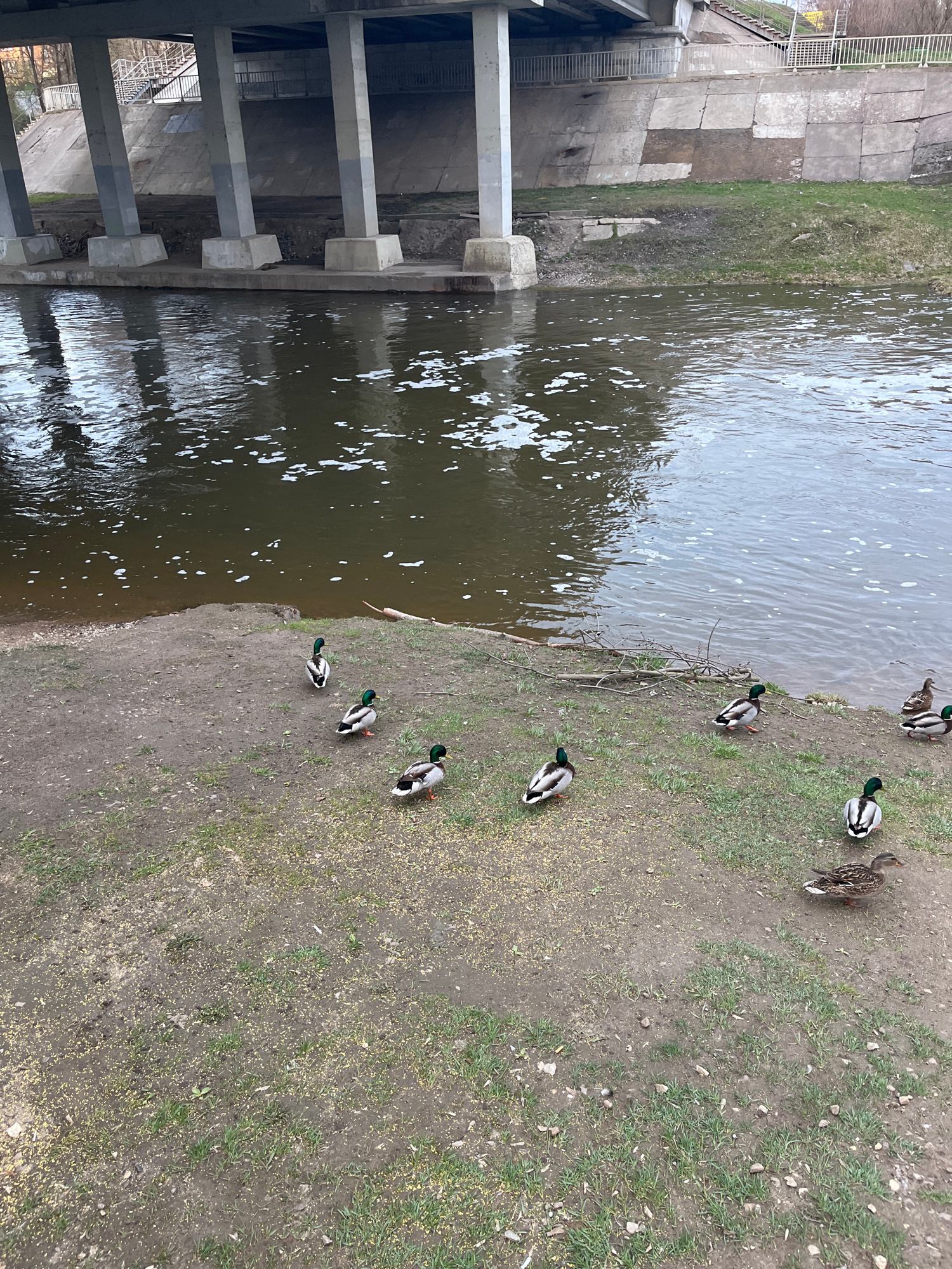This is an eye-level, outdoor photograph taken in the city of Klin, Russia. The photograph shows a river with several ducks on the riverbank and in the water. A bridge is visible on the left-hand side…read more