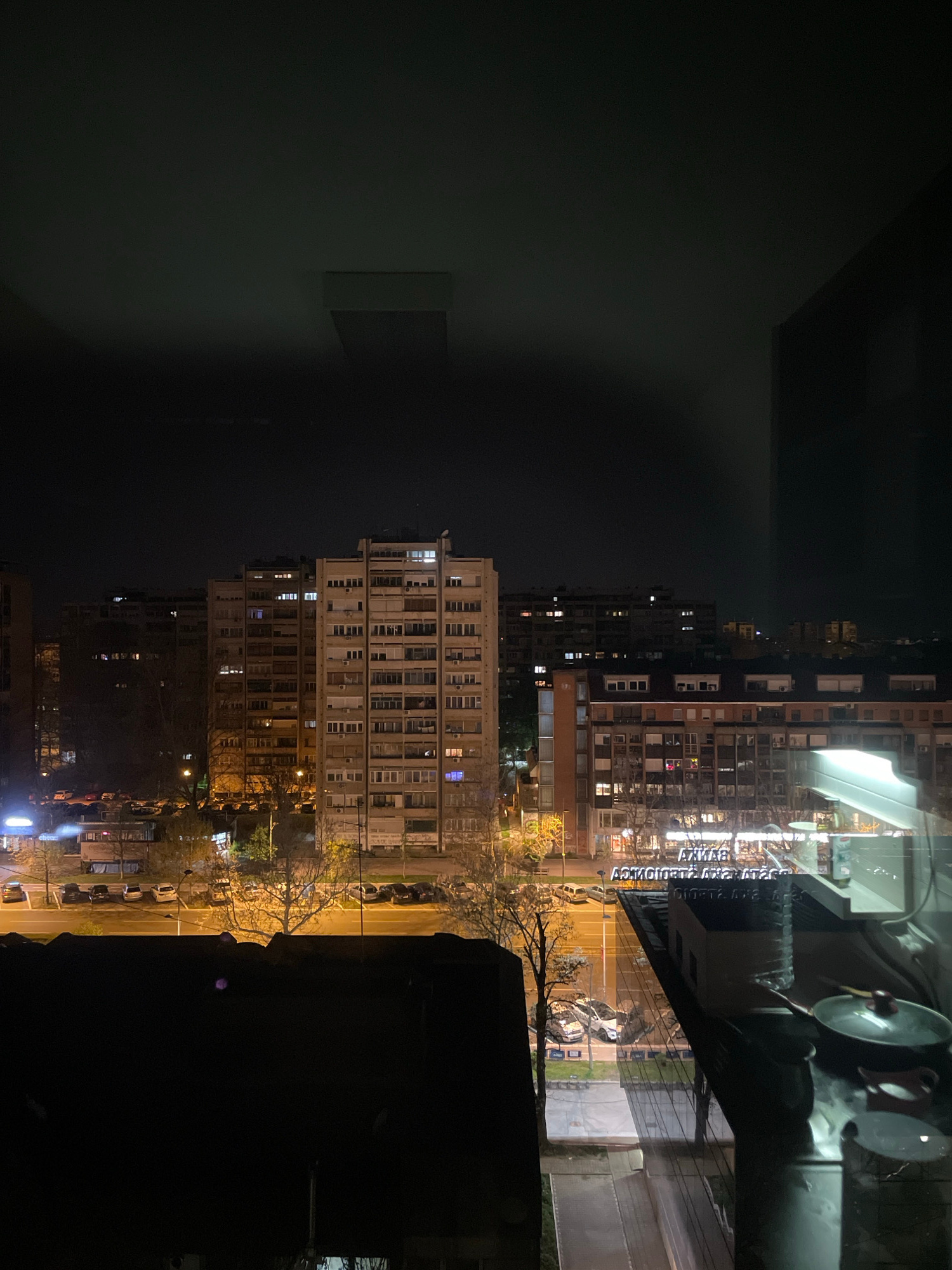The image shows a nighttime urban scene in Novi Sad, Serbia, viewed through a window. The window reflects indoor objects, including a dish rack with dishes. Outside, multiple apartment buildings of va…read more